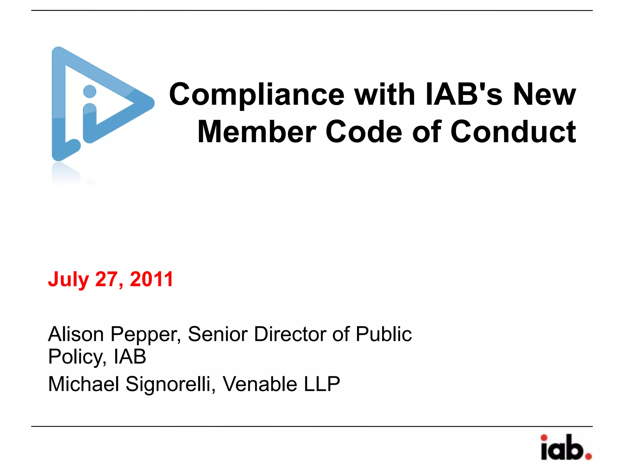 The document summarizes the IAB's new member code of conduct for online behavioral advertising. It establishes principles for education, transparency, consumer control, data security, and accountability. The code requires IAB members to comply by August 29, 2011. It also describes an advertising option icon to indicate adherence to the principles and link consumers to disclosure statements and opt-out mechanisms. The IAB has launched educational resources and an industry website for companies to register and participate in the self-regulatory program.
