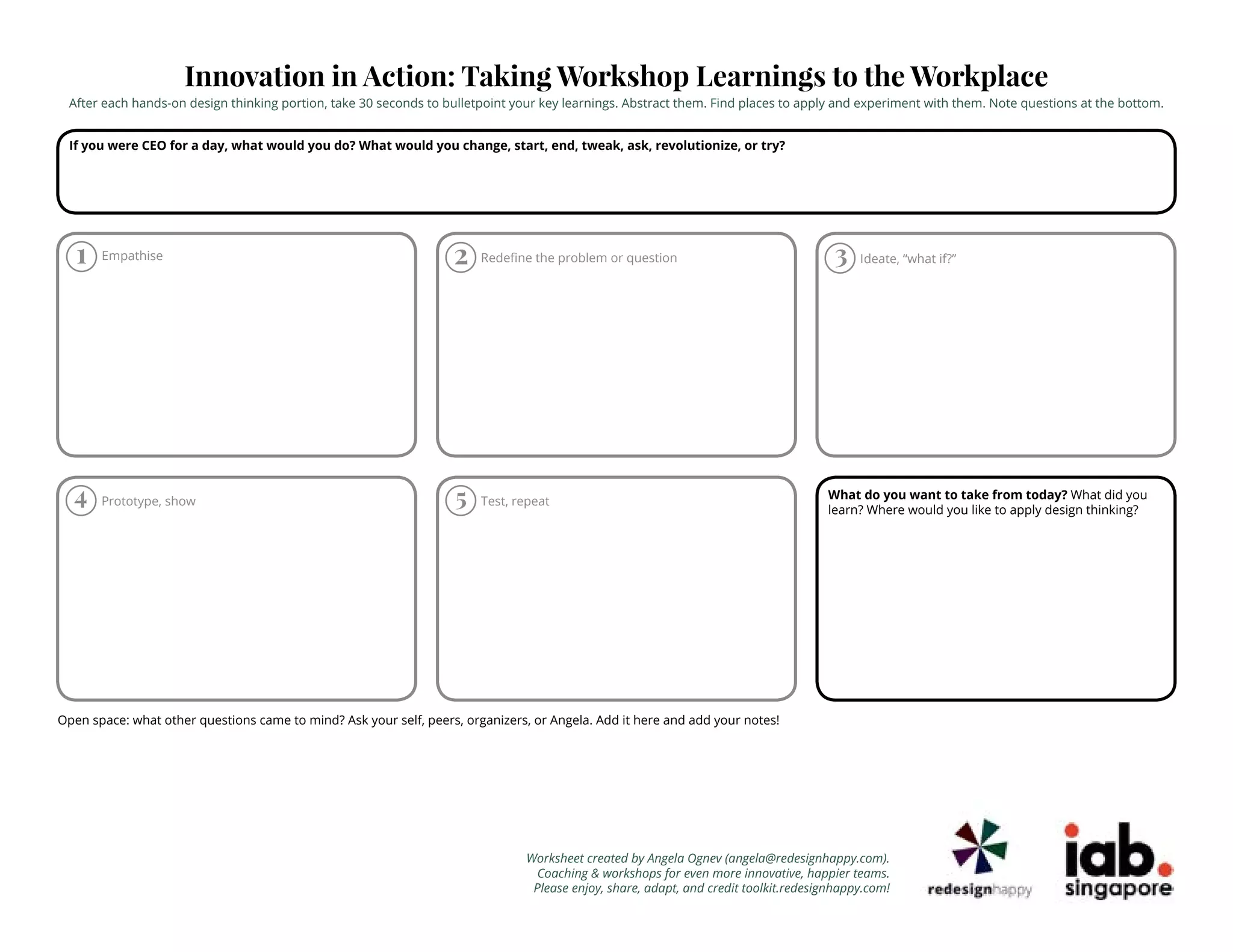 The document outlines a workshop focused on applying design thinking in the workplace, encouraging participants to reflect on their learnings and consider practical applications. It emphasizes the iterative process of empathizing, defining problems, ideating, prototyping, and testing. Additionally, it includes prompts for further exploration and questions for participants to engage with their peers and organizers.