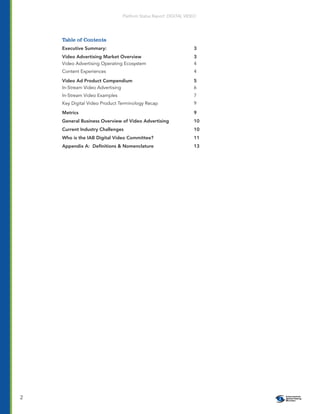 This document provides an overview of the digital video advertising market and the various video ad formats. It discusses the growth of digital video advertising and outlines the key entities in the video advertising ecosystem. It also categorizes major video ad products as in-stream, in-banner, or in-text and describes examples of linear and non-linear in-stream video ads as well as companion ads. The document aims to foster standardization and best practices in the digital video industry.