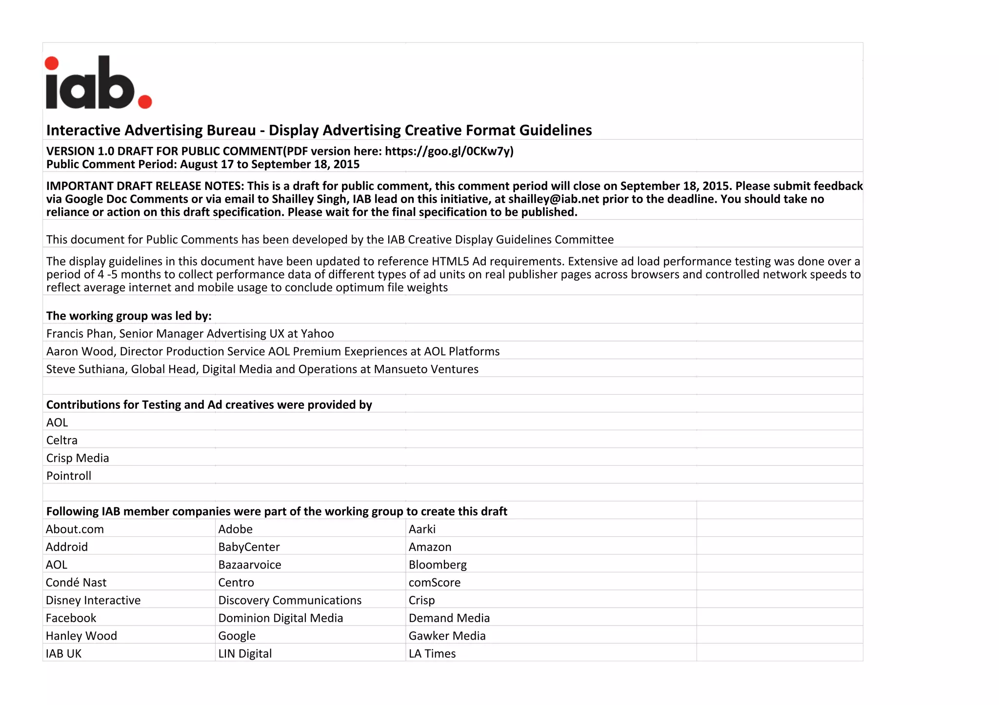 This document provides guidelines for display advertising creative formats, including dimensions, file sizes, and other specifications. It includes guidelines for various ad units like billboards, filmstrips, portraits, pushdowns, sidekicks, and sliders. The guidelines were developed by the IAB Creative Display Guidelines Committee and are intended for public comment before being finalized. Extensive testing was conducted to determine performance and specifications. The document provides examples and links to style guides for each ad unit.