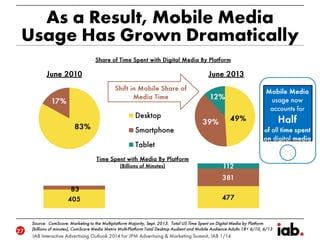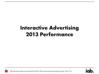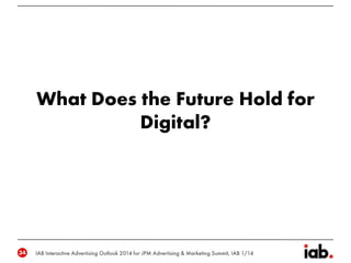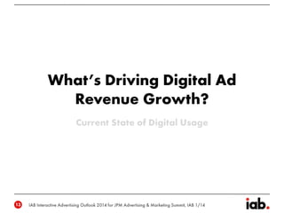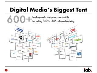 This document provides information about the IAB (Interactive Advertising Bureau), including their mission to empower the media and marketing industries in the digital economy. It lists upcoming IAB events in 2014 and the regional IAB organizations around the world. Charts show US advertising revenue sources and percentages in 2012 and 2011.