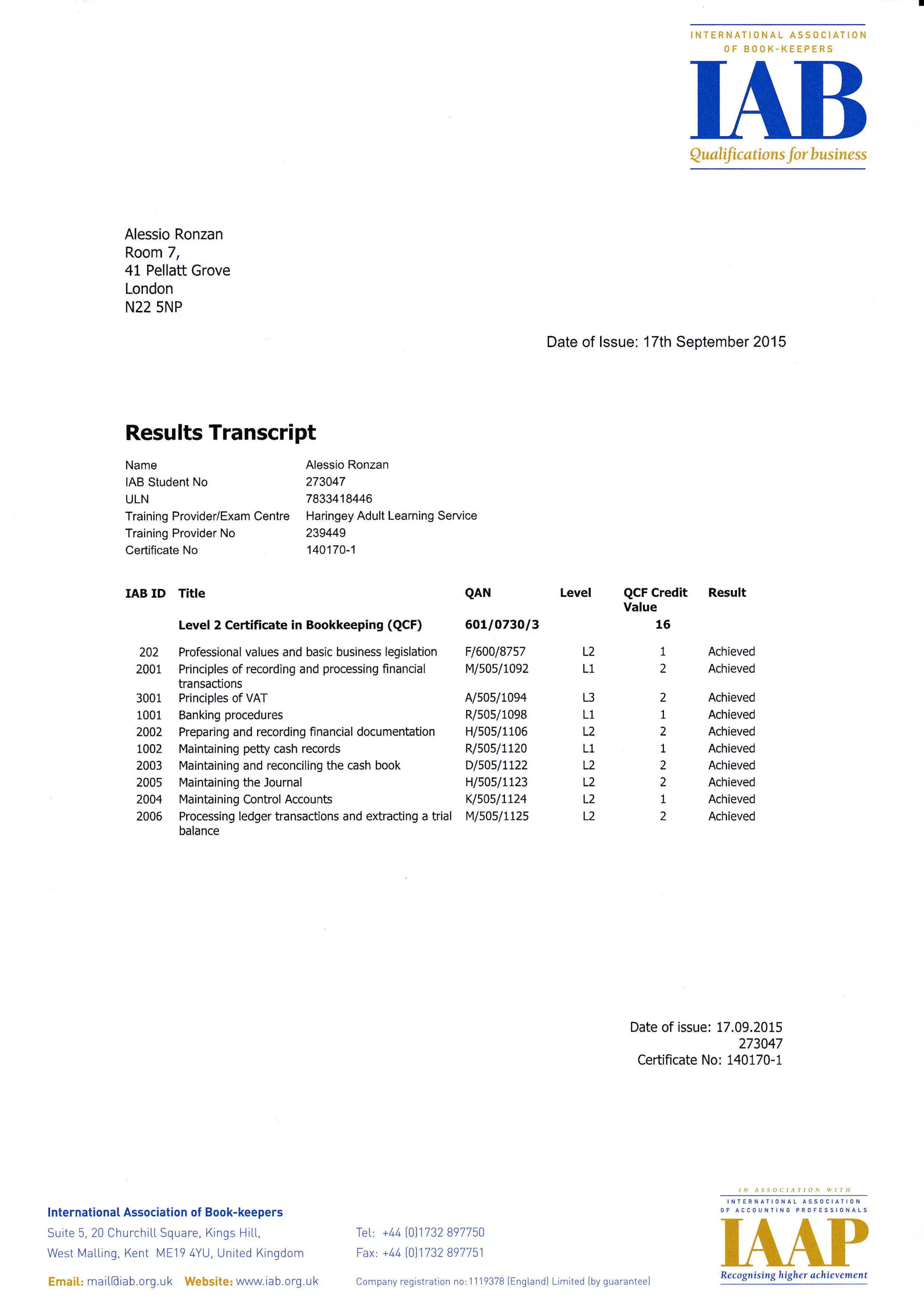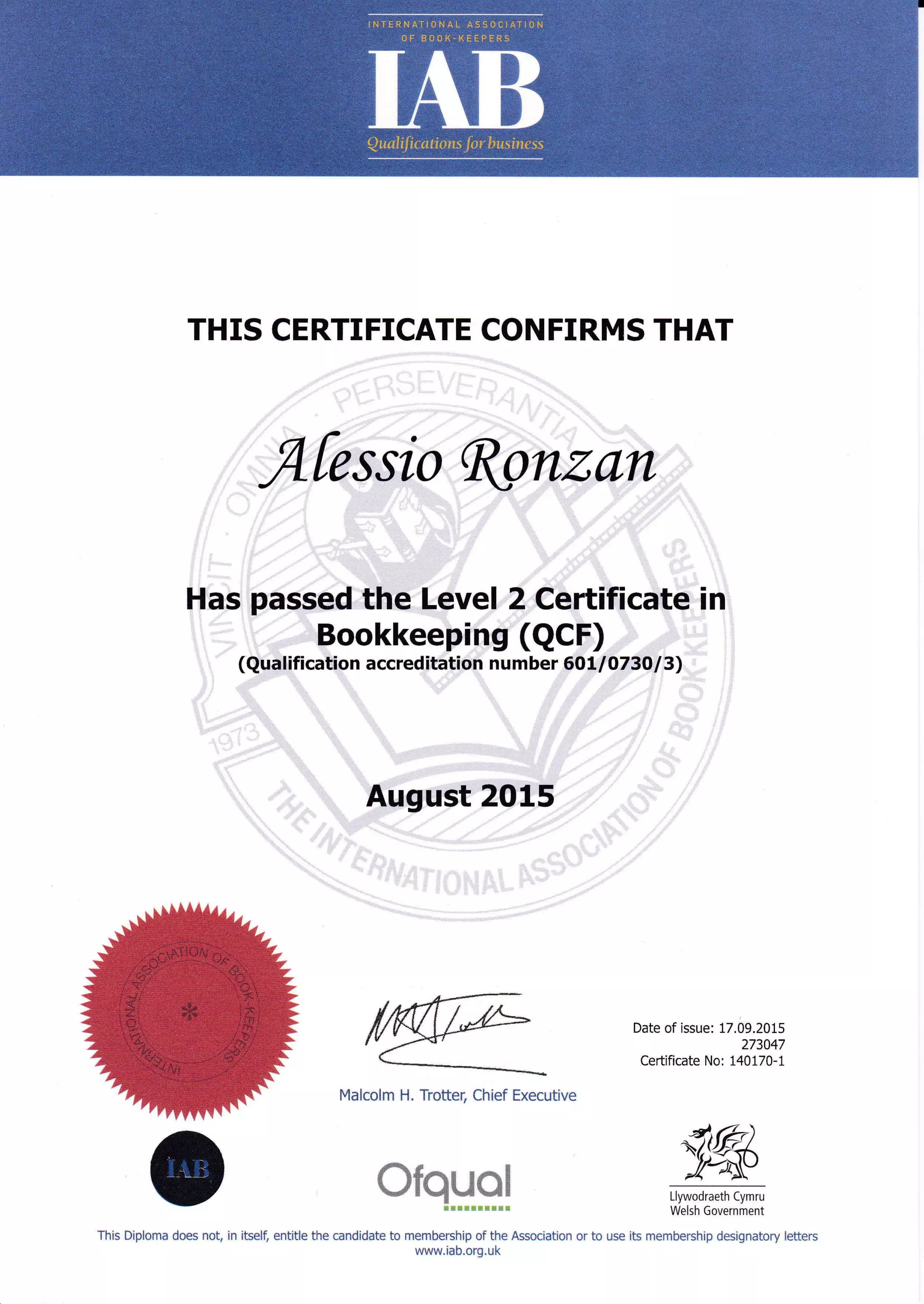 This certificate confirms that Alessio Ronzan has achieved a Level 2 Certificate in Bookkeeping from the International Association of Book-keepers. The certificate provides details of the 11 units completed as part of the qualification including their titles, credit values, and levels. It also lists the qualification number, date of issue, and the association that issued the certificate.
