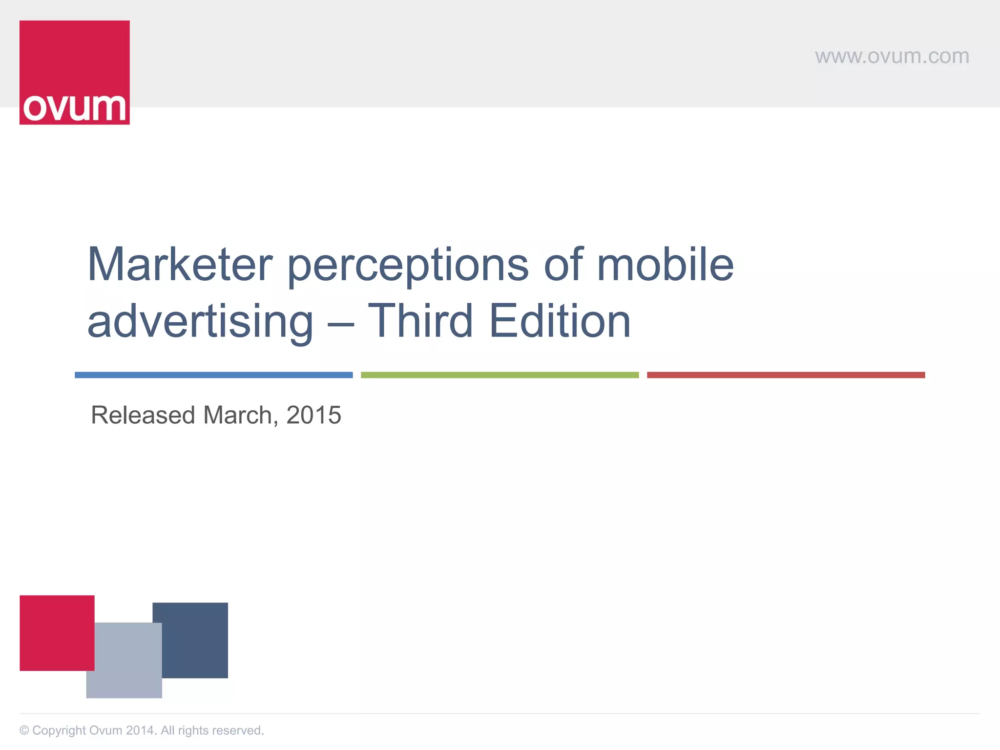 The document summarizes key findings from a survey of marketers regarding mobile advertising. Some of the main findings include: