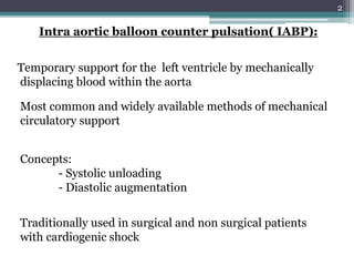 - Increase in aortic Diastolic Press. by 30 % ( raise coronary blood flow)