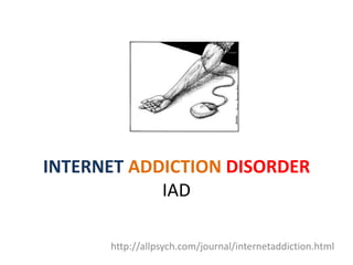 Internet addiction disorder (IAD) is a psychological condition characterized by excessive internet use that negatively impacts relationships, school or work performance, and daily life habits and routines.