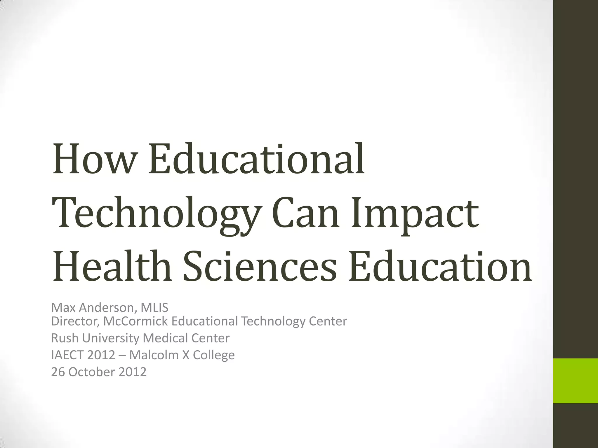 This document discusses trends in educational technology and its impact on health sciences education. It begins by outlining trends like the explosion of new information, digitization of content, new generations of learners, and emerging instructional technologies. It then discusses changes like distance education, blended learning, use of mobile devices, augmented reality, and simulation technology. The document recommends supporting faculty adoption of new technologies and fosters collaboration. It concludes by stating mobile will be the future of learning and discusses innovations in research, publishing, and assessment. The overall impact is a shift from traditional methods to more digital, mobile, and simulation-based approaches.