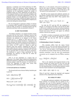 The document proposes a new VLSI algorithm for computing the discrete Hartley transform (DHT) that is well-suited for implementation on a highly parallel and modular VLSI architecture. The algorithm can efficiently split the DHT computation into multiple parallel parts that can be executed concurrently. It also leverages sub-expression sharing to significantly reduce hardware complexity. By efficiently sharing multipliers with the same constant, the number of required multipliers is much smaller than existing algorithms, and these constant multipliers can be efficiently implemented in VLSI.