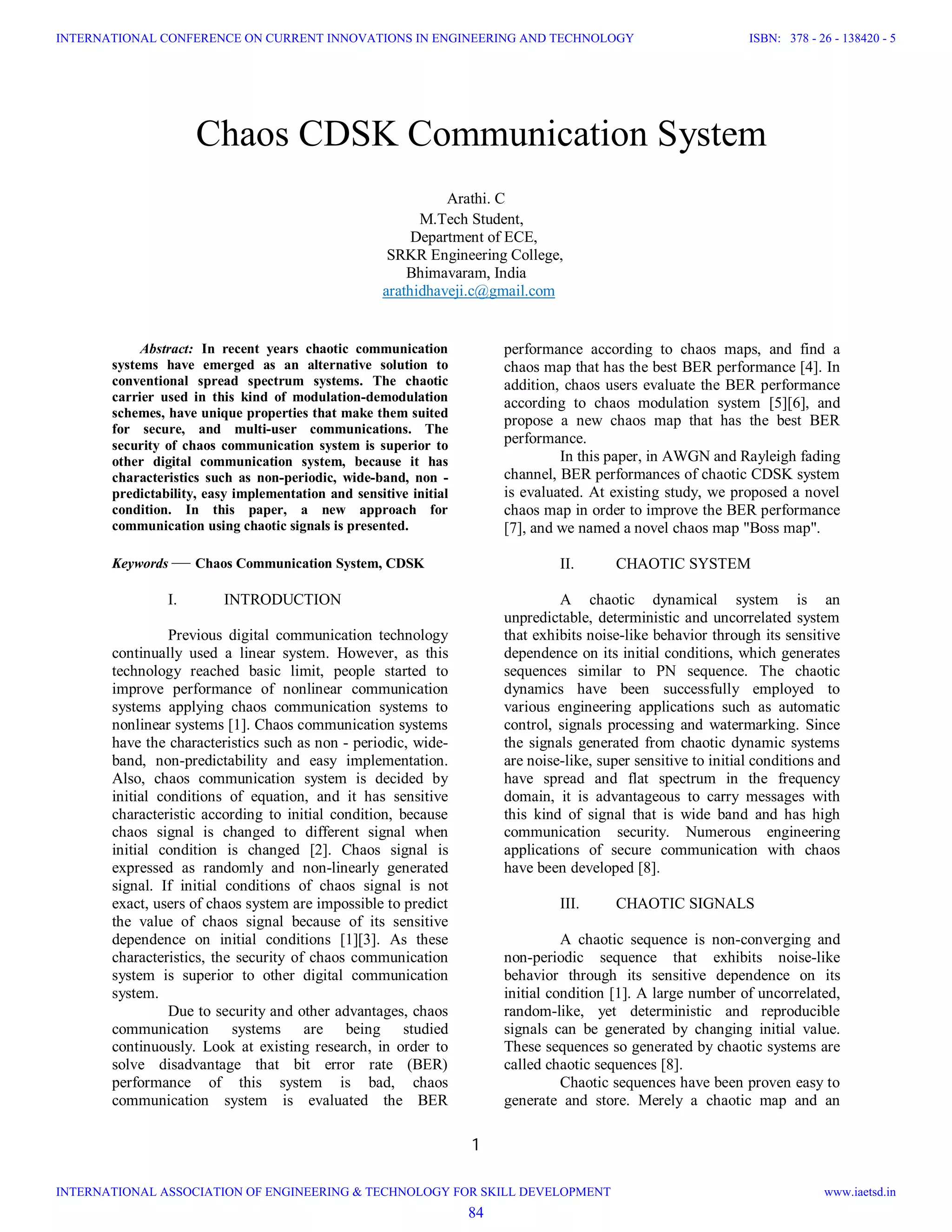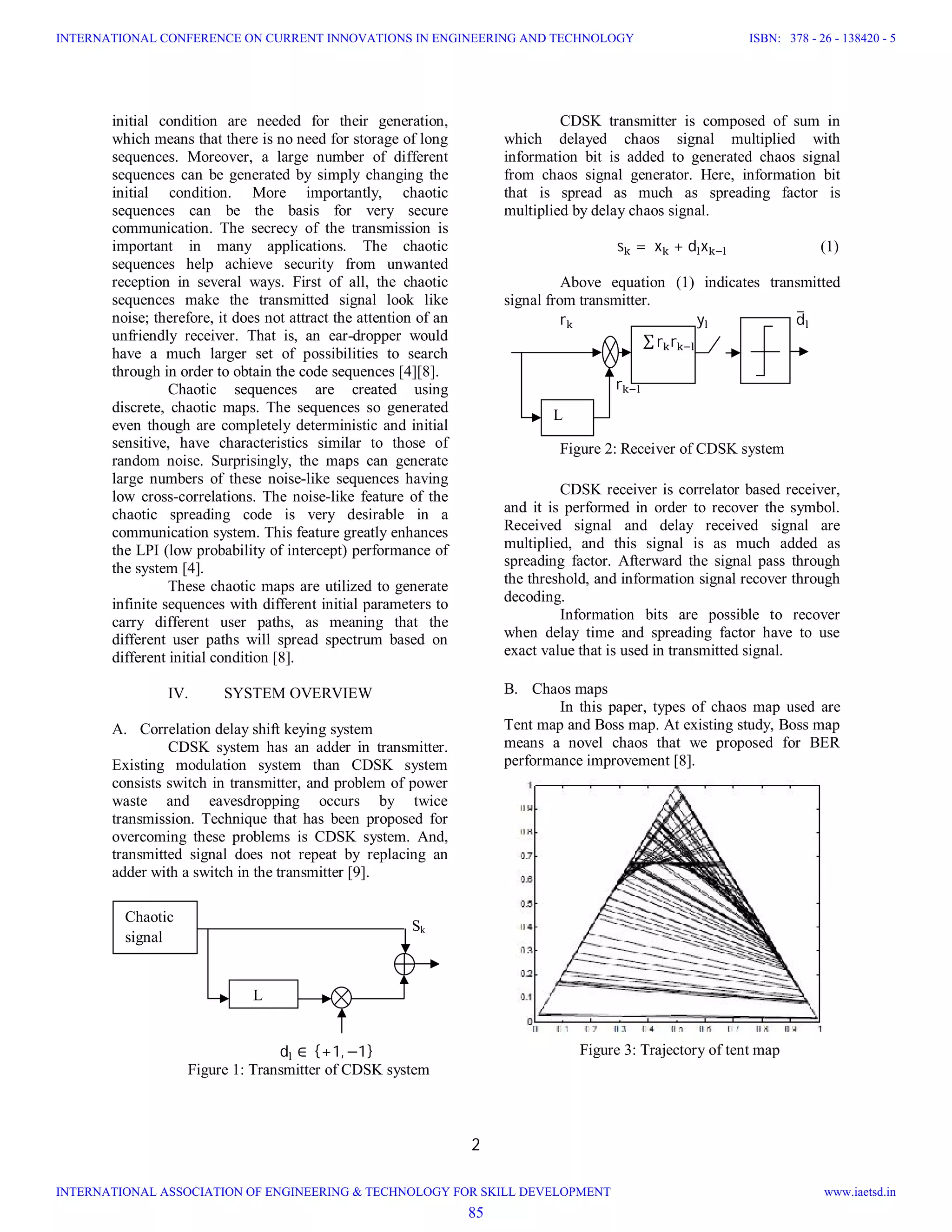 This document proposes and evaluates a new chaotic communication system called Correlation Delay Shift Keying (CDSK). It summarizes the characteristics and advantages of using chaotic signals for communication. It then describes the CDSK system and compares its bit error rate performance using two different chaos maps (Tent map and a newly proposed Boss map) in additive white Gaussian noise and Rayleigh fading channels. The results show that the Boss map provides better bit error rate performance than the Tent map.