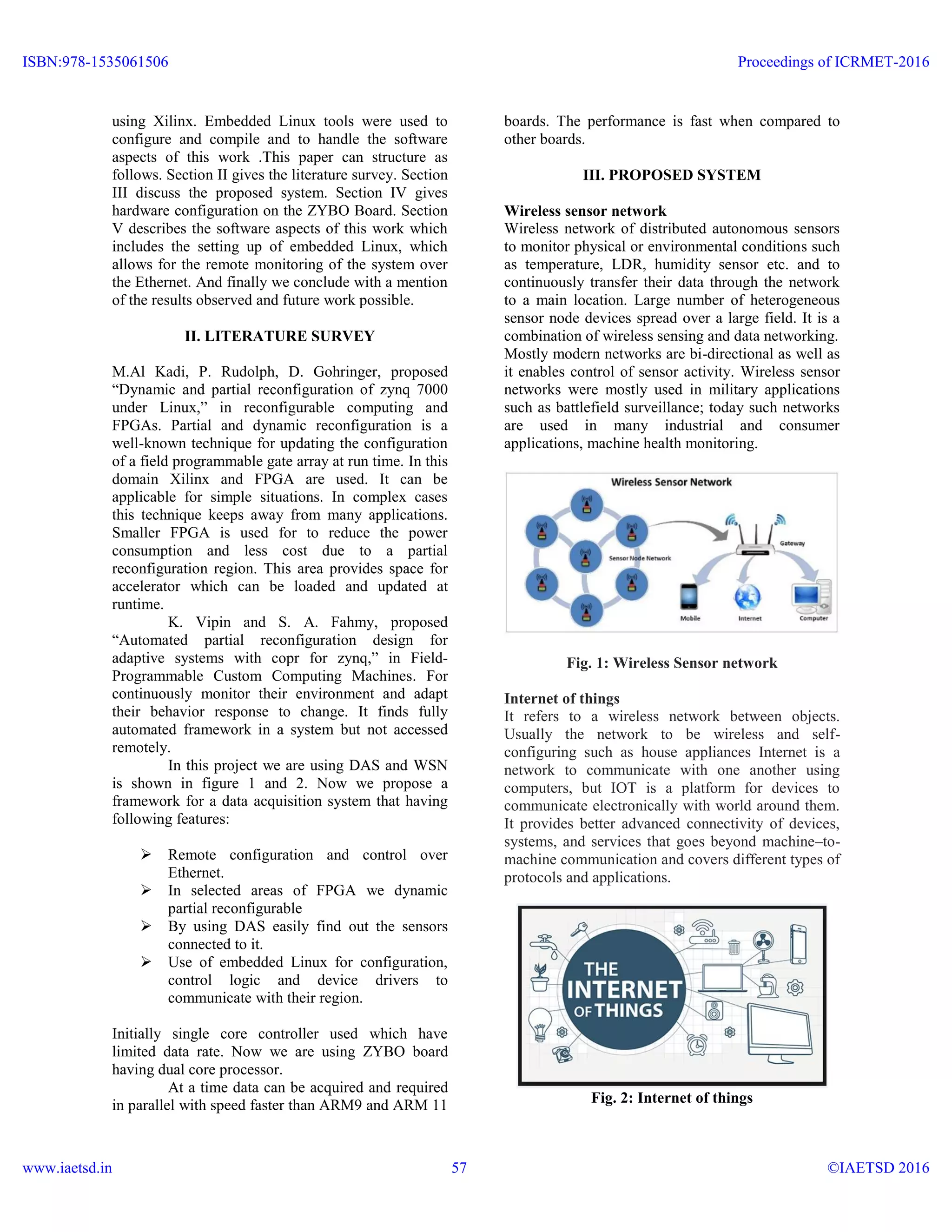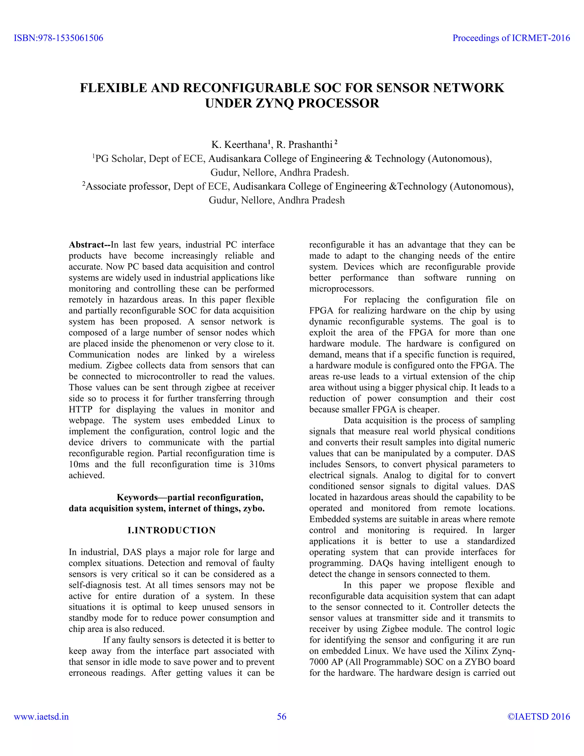 This document proposes a flexible and reconfigurable system on chip (SOC) for a sensor network using a Zynq processor. The system would allow remote configuration and control over Ethernet. It uses a Zynq-7000 all programmable SOC on a ZYBO board, with a partially reconfigurable region on the FPGA. Sensor values would be collected via Zigbee and transmitted to the ZYBO controller over wireless. Embedded Linux would implement the control logic and device drivers to communicate with the reconfigurable region. This flexible design allows adaptation to different connected sensors with partial reconfiguration times of 10ms or full reconfiguration in 310ms.