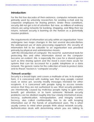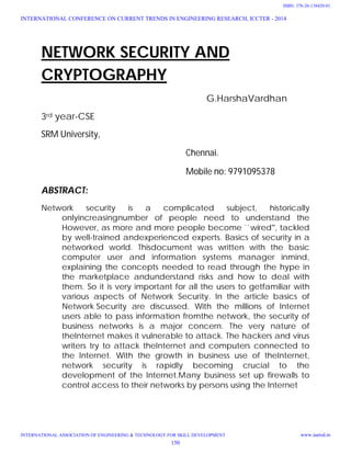 This document discusses network security and cryptography. It begins by introducing network security concepts like secrecy, authentication, nonrepudiation, and integrity. It then discusses cryptography topics such as symmetric and public key encryption. Specific algorithms like RSA are explained. The document also discusses security issues at different layers of the network and summarizes techniques used at each layer.