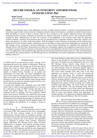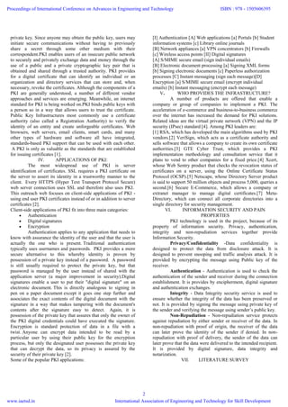 This document summarizes a research paper on developing a secure email system using public key infrastructure (PKI). It begins with an introduction describing the need for additional security mechanisms for email beyond what standard email protocols provide. It then provides an overview of how PKI works using public/private key encryption and digital signatures to provide security properties like authentication, integrity, confidentiality and non-repudiation. The document reviews PKI technologies and applications, how infrastructure is provided, and discusses information security and 'PAIN' properties that PKI enables. It concludes with a literature review of cryptography basics like symmetric and asymmetric key algorithms that PKI is built upon.