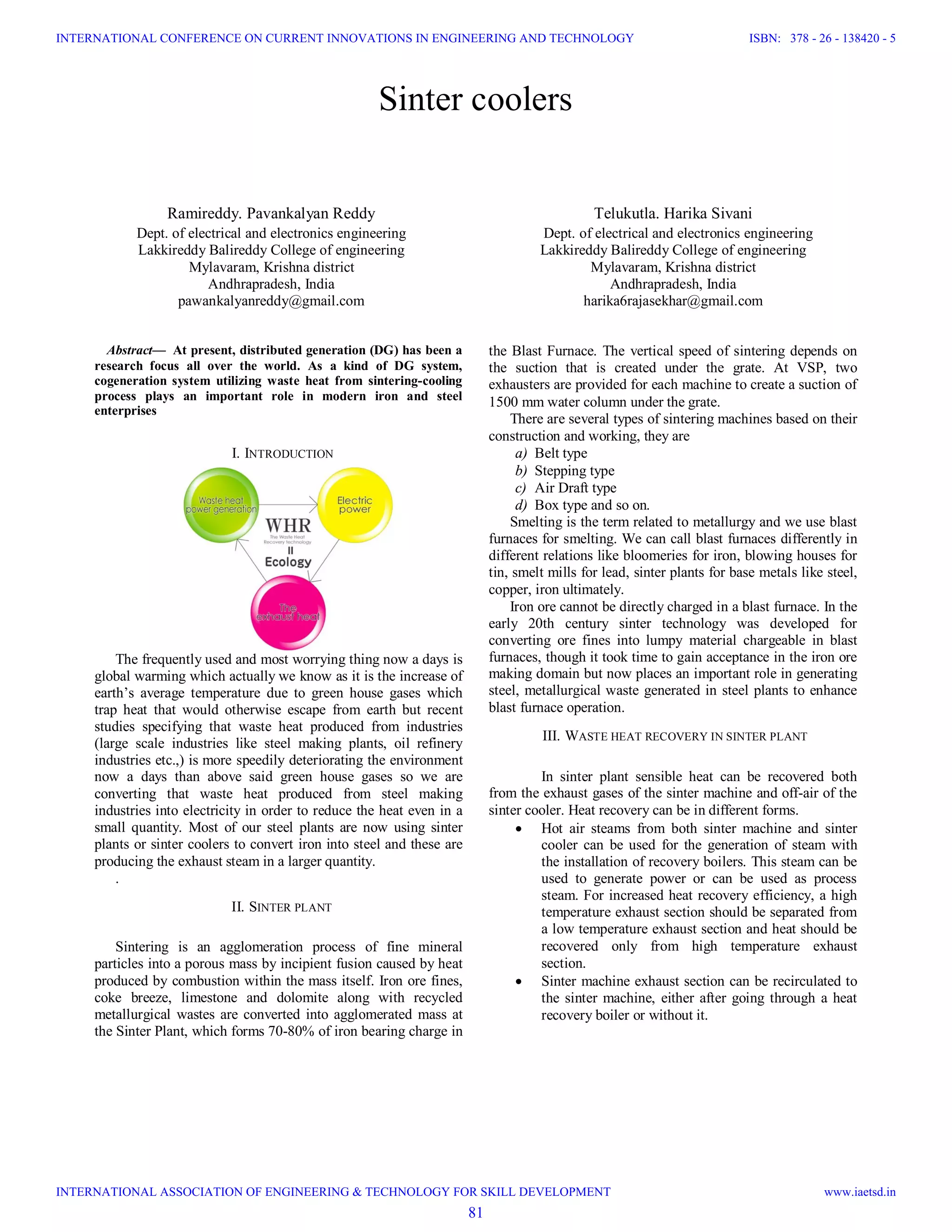 The document discusses a waste heat recovery system for sinter coolers in steel plants. Sinter coolers produce large amounts of exhaust heat during the steel production process. The proposed system recovers sensible heat from the exhaust gases of sinter machines and coolers through heat recovery hoods. The captured heat is used to generate steam in a heat recovery boiler, which then generates electricity through a turbine and generator. Recovering waste heat in this way improves energy efficiency, reduces carbon emissions, and can help meet increasing global energy demands.