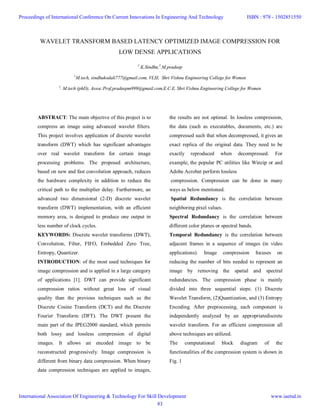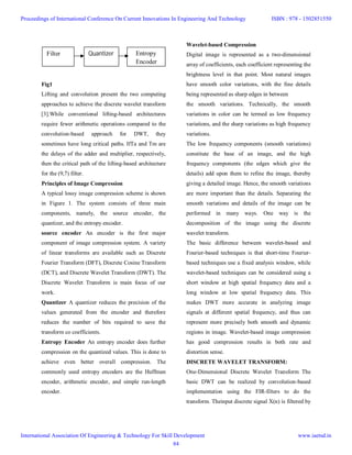 This document discusses wavelet transform based image compression. It proposes a new discrete wavelet transform (DWT) architecture based on fast convolution that reduces hardware complexity and memory requirements while also decreasing the critical path delay. This allows the system to produce outputs in fewer clock cycles for improved efficiency. The proposed architecture is evaluated against existing designs and shown to achieve better performance in terms of reduced area and processing time.