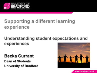 The document discusses expectations and experiences of university students based on interviews with students. It finds that students had varying expectations prior to arriving, with some worried about skills or the transition after a long time away from education. Students reported learning best through practical and interactive methods rather than just listening. The experiences of university were generally positive, with making friends being a highlight. The document discusses how the university student population has changed with more diverse and non-traditional students and explores ways universities can better support student transition and engagement through activities like orientation, community building and listening to the student voice.