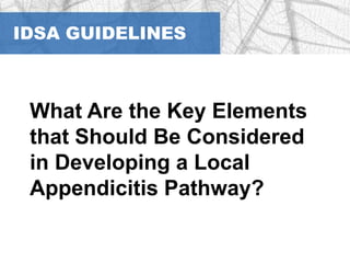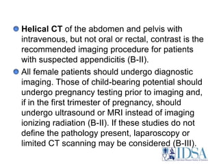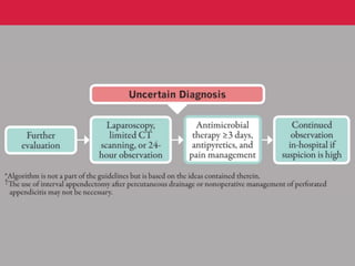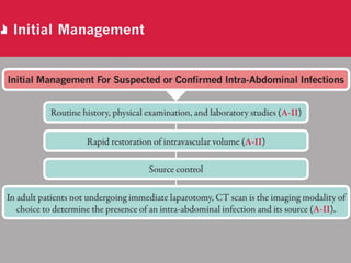 The document provides guidelines for the diagnosis and management of complicated intra-abdominal infections in adults and children, emphasizing appropriate imaging, fluid resuscitation, and initiation of antimicrobial therapy based on clinical status. It outlines early intervention strategies, source control procedures, and the use of specific antibiotic regimens while considering resistance patterns and local susceptibility profiles. Additionally, it highlights recommendations for managing acute cholecystitis, cholangitis, and appendicitis, with a focus on appropriate diagnostic imaging and timing of therapeutic interventions.