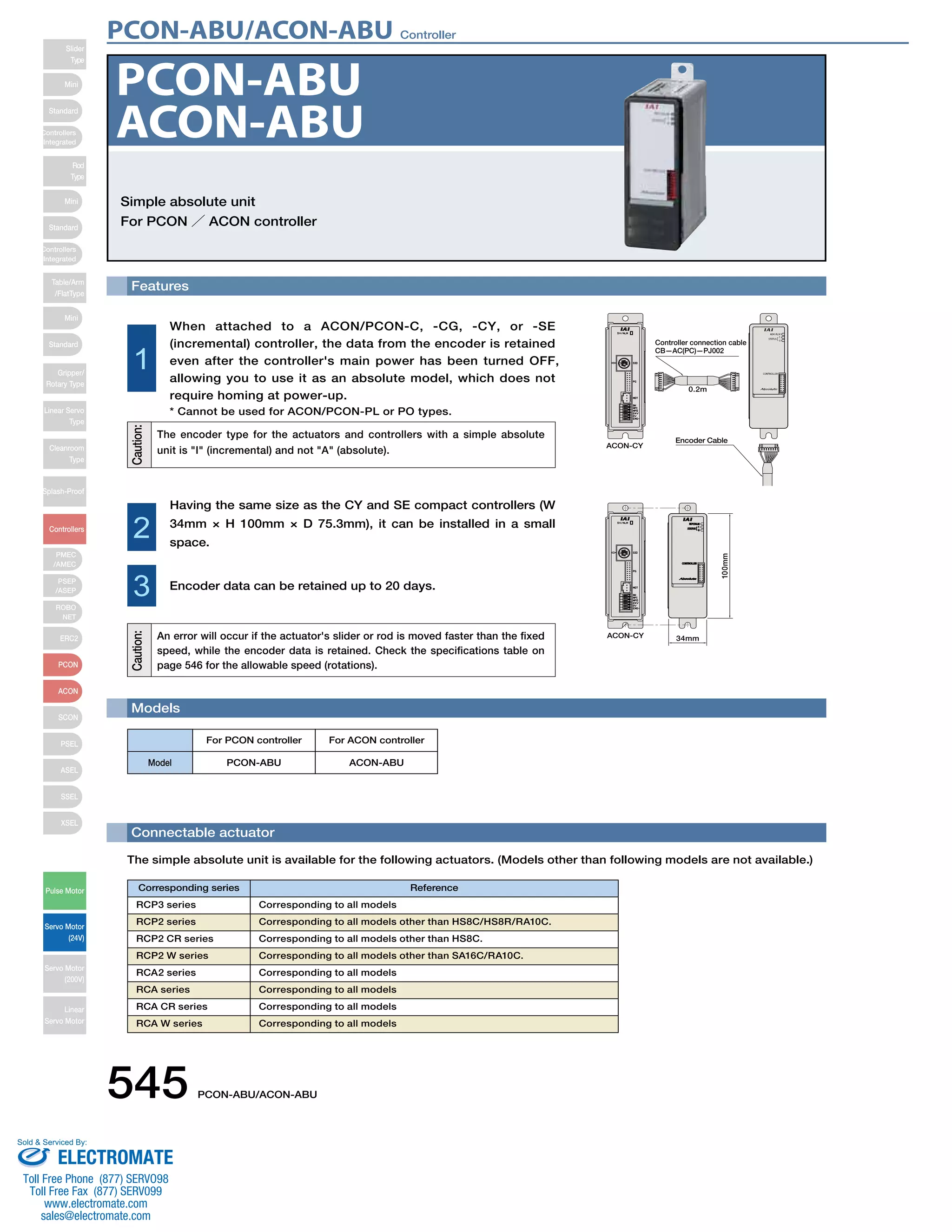 The document describes a simple absolute unit that can be attached to certain ACON/PCON controllers to allow them to function as absolute models without needing to home at power-up. It retains encoder data for up to 20 days. The unit is small, measuring 34mm x 100mm x 75.3mm, and can be used with compatible RCA and RCP series actuators. It requires a 24V power supply and includes a battery backup.