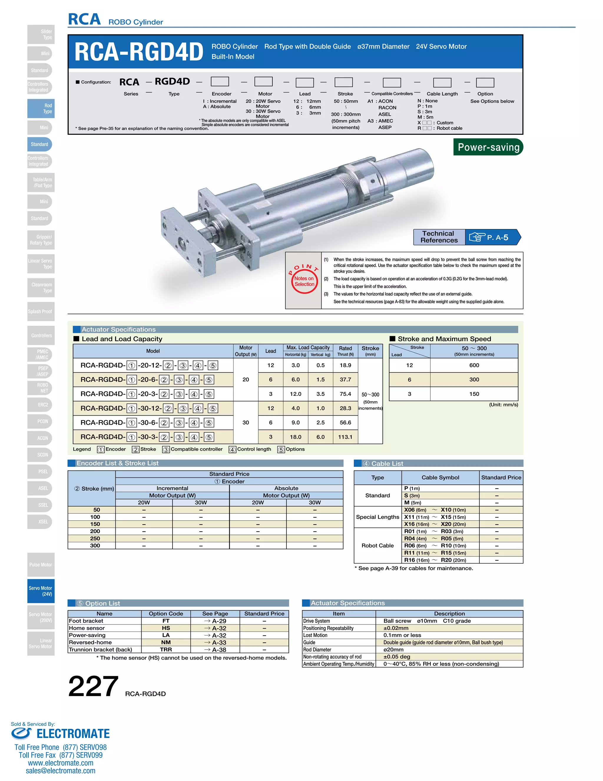 The document provides specifications for the RCA-RGD4D ROBO cylinder, including its dimensions, weight, stroke length, load capacity, speed, and compatible controllers. It has a ball screw drive, double guide, stroke lengths between 50-300mm, and load capacities between 0.5-18kg depending on the model. The cylinder can be operated with various controller options like the ASEL, ACON, ASEP, and RACON which support different interfaces and functionalities.