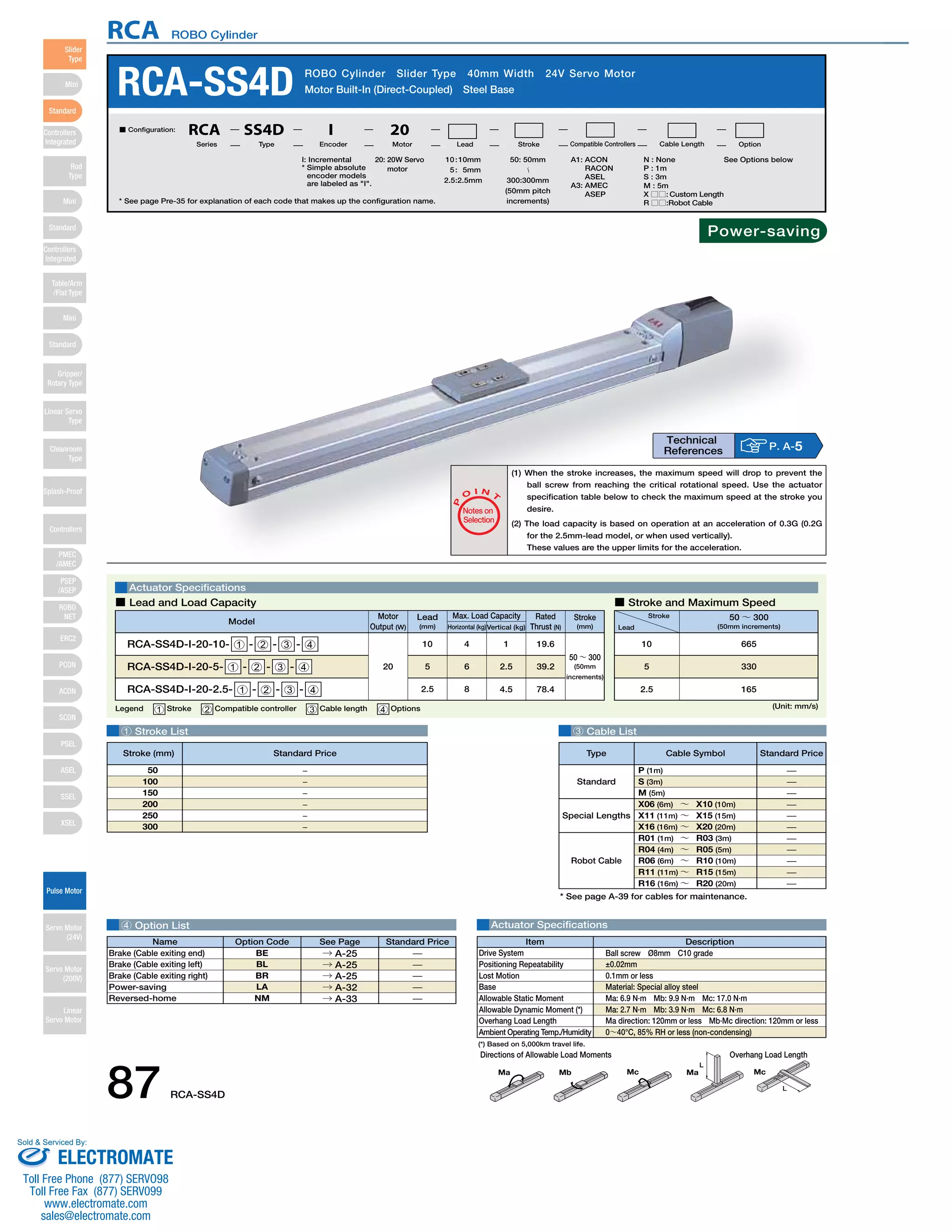 The document provides specifications for the RCA ROBO Cylinder actuator including: