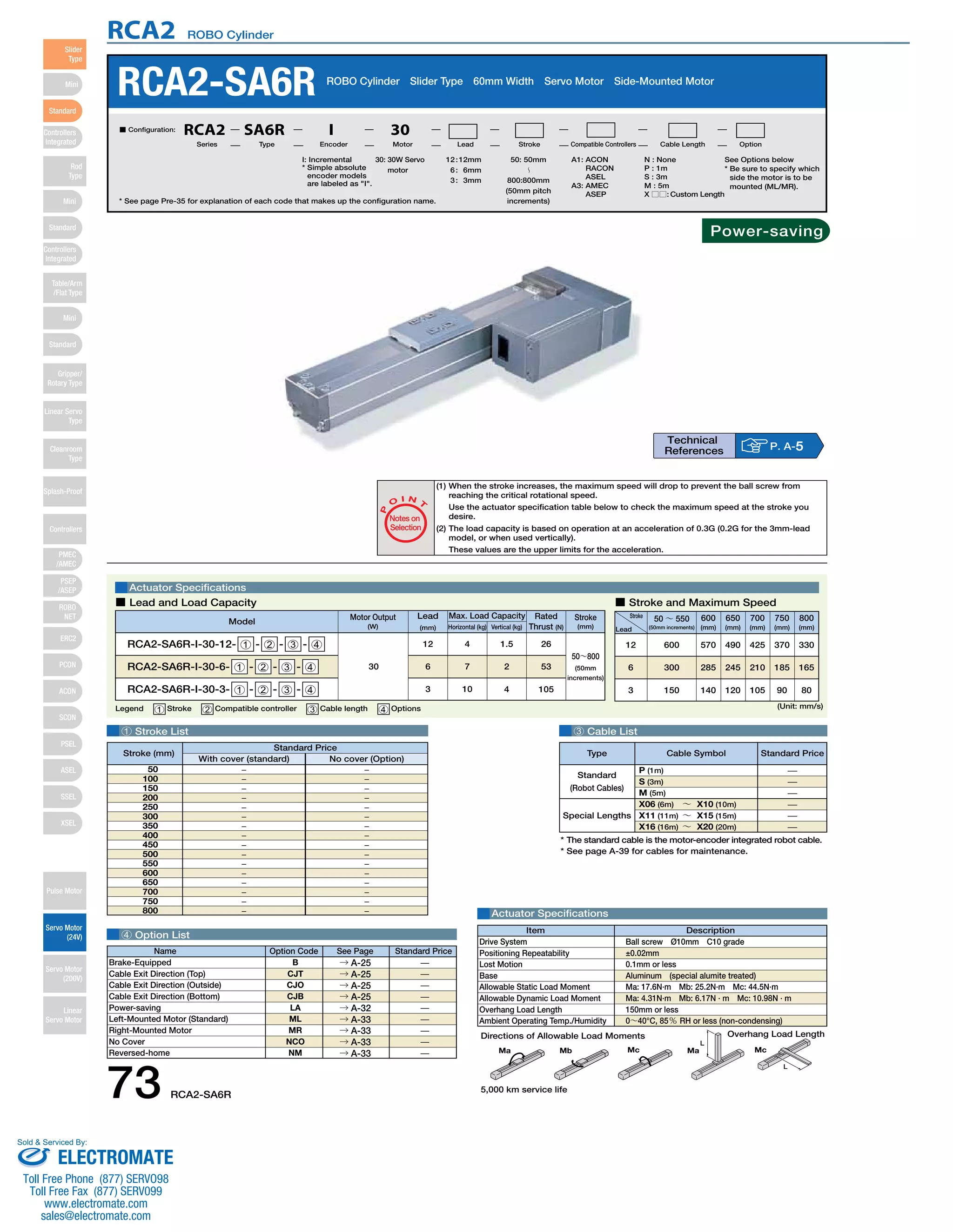 This document provides specifications for the RCA2-SA6R ROBO Cylinder. It includes details on (1) maximum speeds at different strokes, (2) load capacities based on 0.3G acceleration, and (3) compatible controller options for operating the cylinder. Dimensional drawings and specifications for stroke lengths, loads, speeds, and other performance characteristics are also provided.