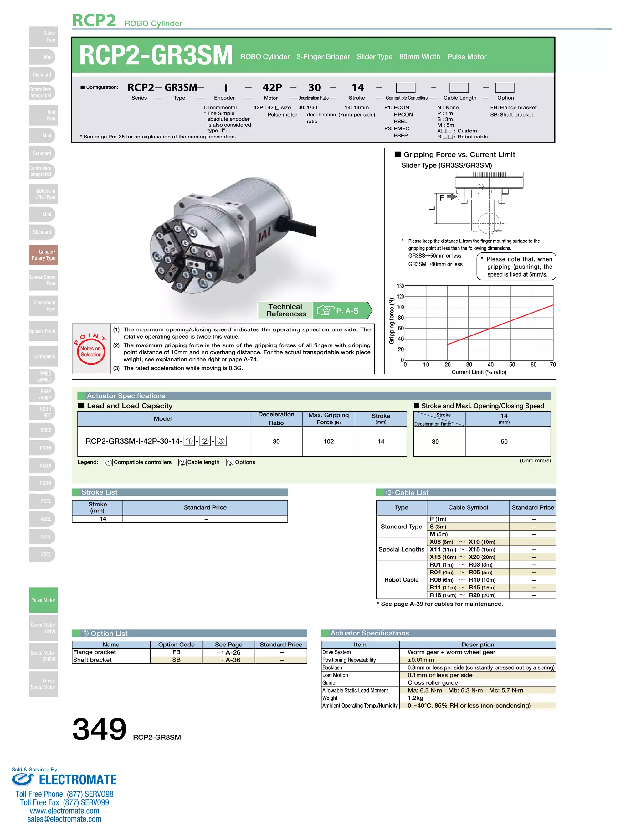 The document provides specifications for the RCP2-GR3SM ROBO Cylinder 3-Finger Gripper Slider Type 80mm Width Pulse Motor, including:
