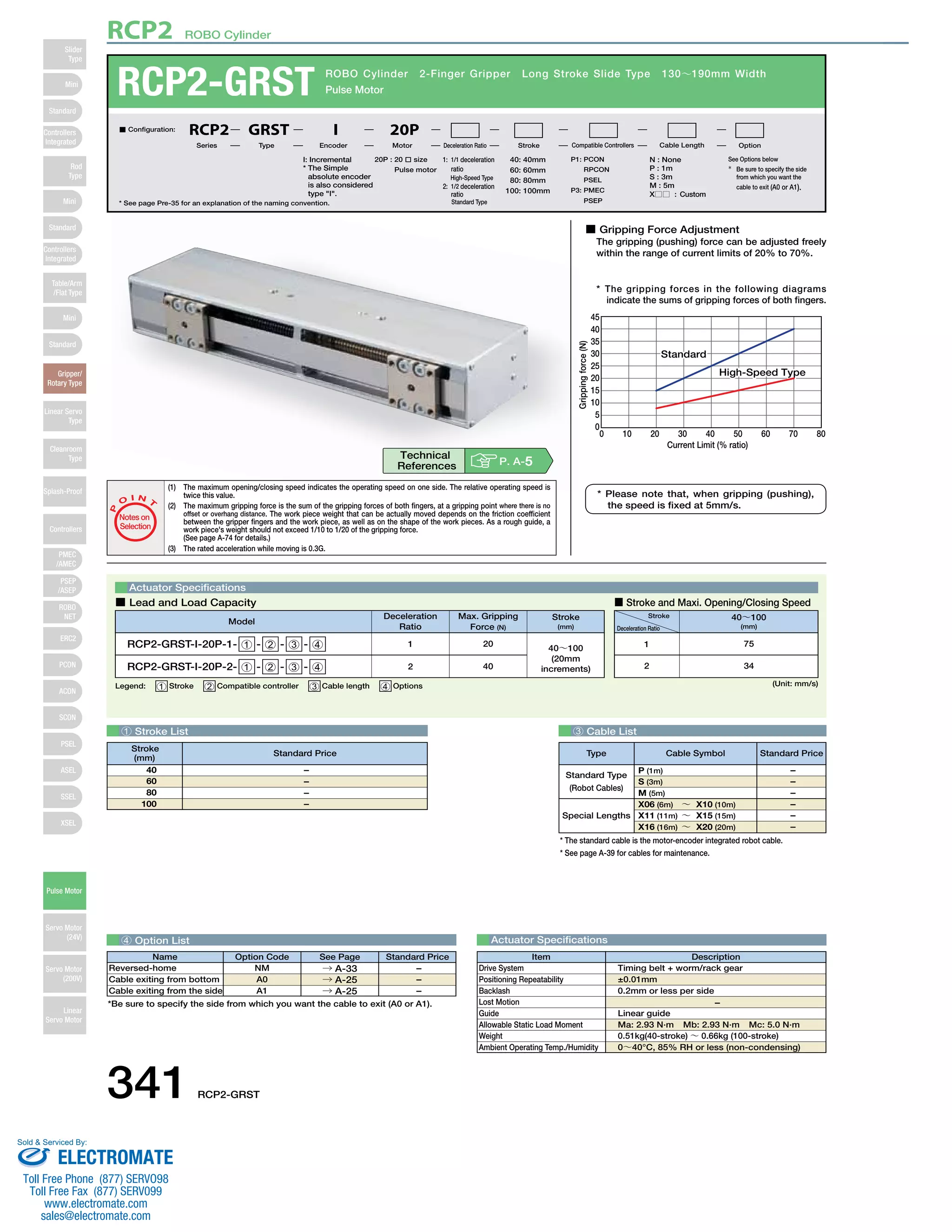 The document provides specifications for the RCP2-GRST ROBO Cylinder 2-Finger Gripper Long Stroke Slide Type actuator. It has a stroke range of 130-190mm, maximum gripping force of 20-40N, and deceleration ratio of 1/2. It can be operated by various ROBO controllers including the PMEC, PSEP, PCON and PSEL models.