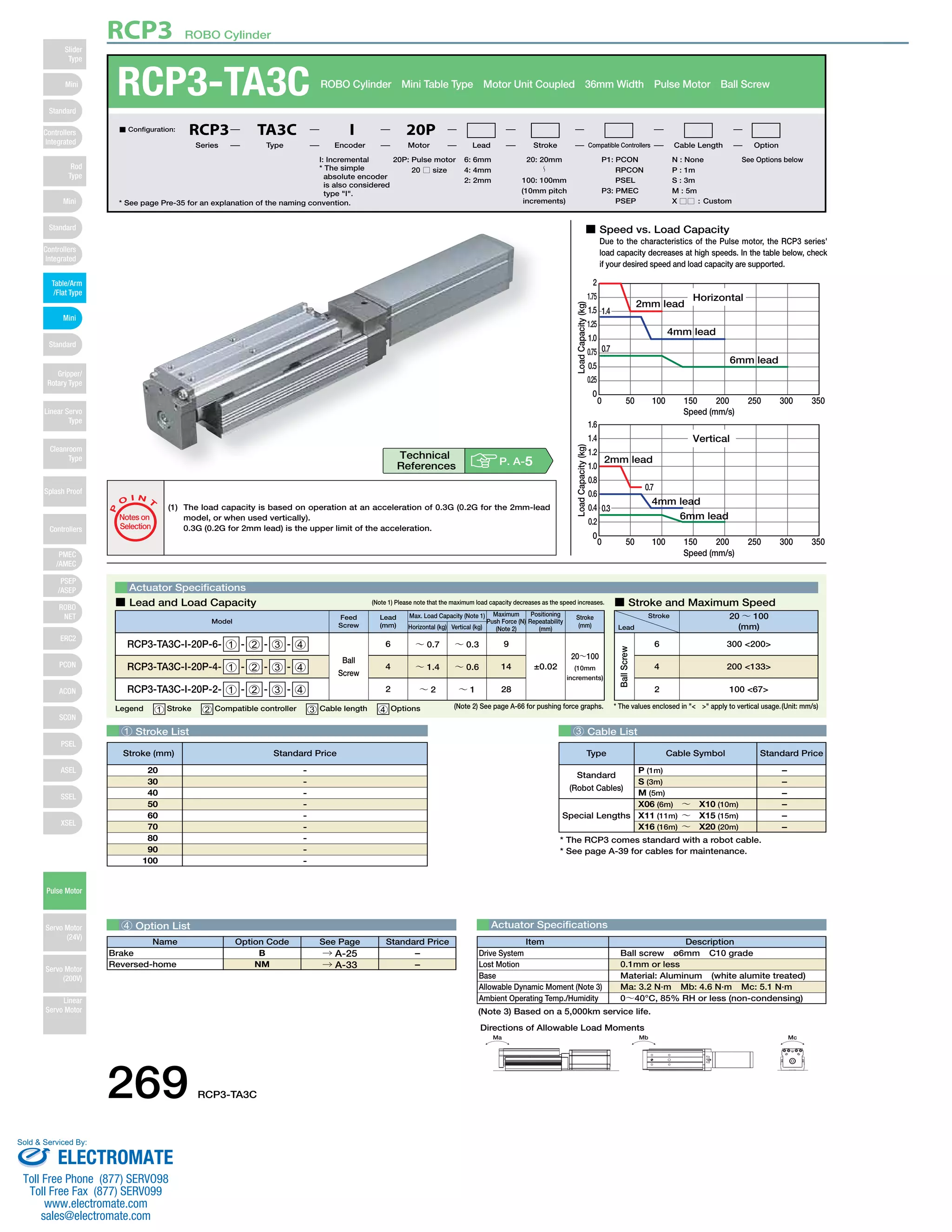 This document provides specifications for the RCP3-TA3C ROBO Cylinder mini table type motor unit. It includes details on the ball screw lead and load capacity, maximum speed and stroke, repeatability, and maximum push force for models with ball screw leads of 2mm, 4mm, and 6mm. Dimensional drawings and weights are provided for no brake and brake-equipped models across strokes of 20mm to 100mm. Compatible controllers include solenoid valve types, positioner types, pulse train input types, serial communication types, and program control types.