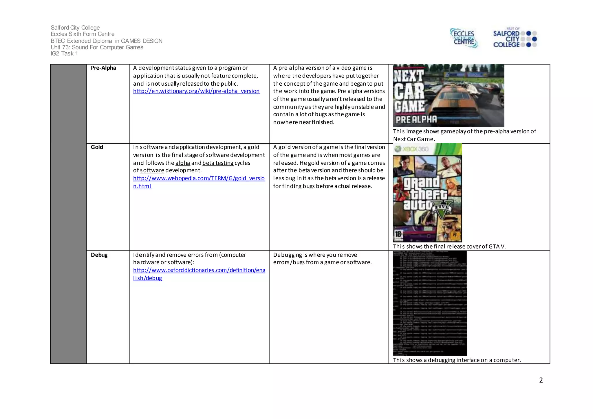 The document is a glossary of terms related to video game design produced by a student at Salford City College. It contains definitions for 27 terms, including alpha, beta, demo, debug, collision, animation, and frames per second. For each term, the student provides a short definition from an online source, describes how the term relates to their own video game work, and includes an image or video demonstrating the term. The glossary covers key concepts in game development, testing, graphics, and programming.