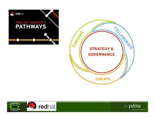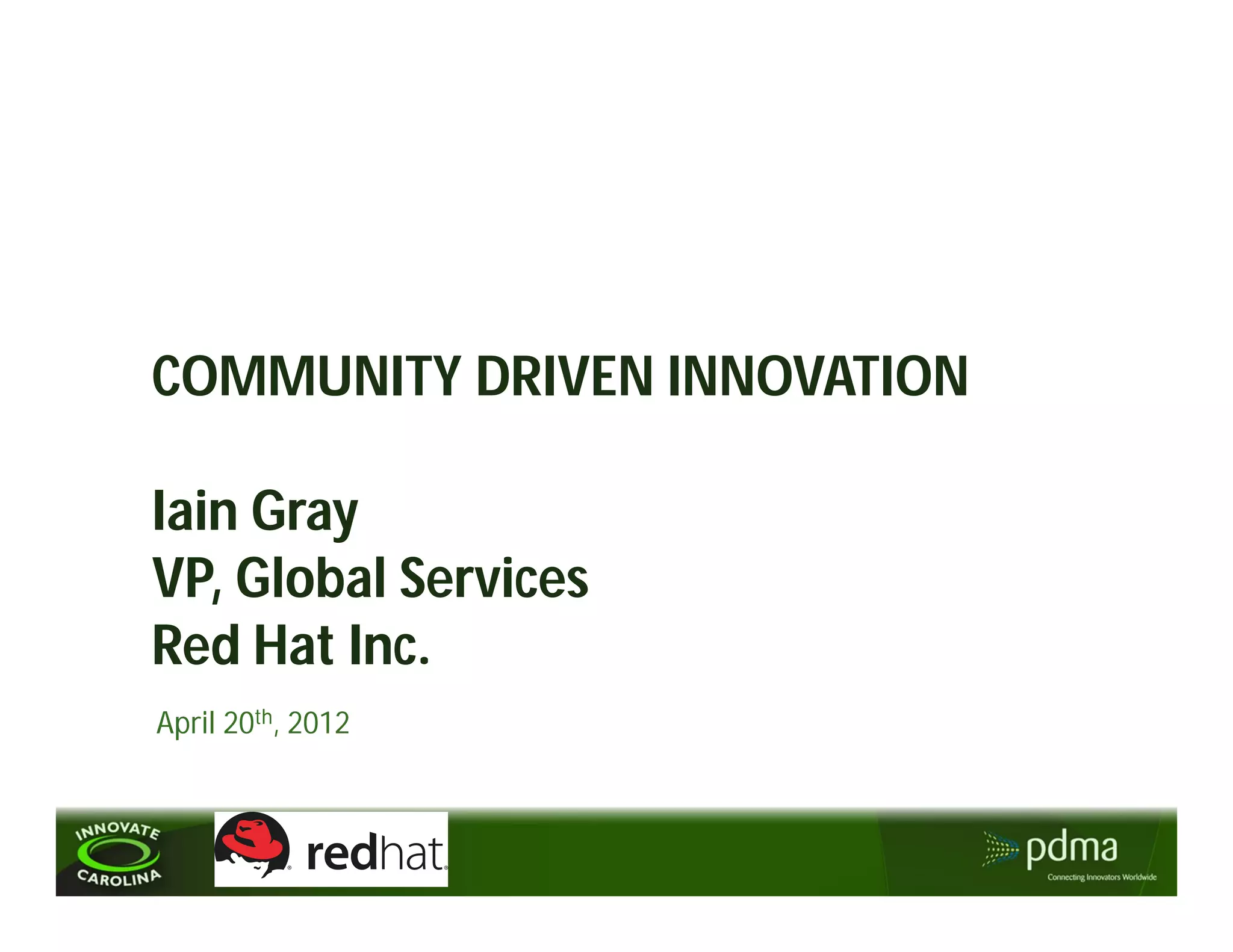 This document discusses community driven innovation and how organizations can leverage external communities. It begins by introducing Red Hat's model of participating in open source communities to develop products in a cost effective manner. It then presents a community innovation pyramid with four levels: 1) listen to customers, 2) listen to the community, 3) innovate through the community, and 4) innovate within the community. The rest of the document provides advice on how organizations can operate at each level of the pyramid, including how to build and engage external communities, integrate community input, and adapt internal processes to support shared innovation.