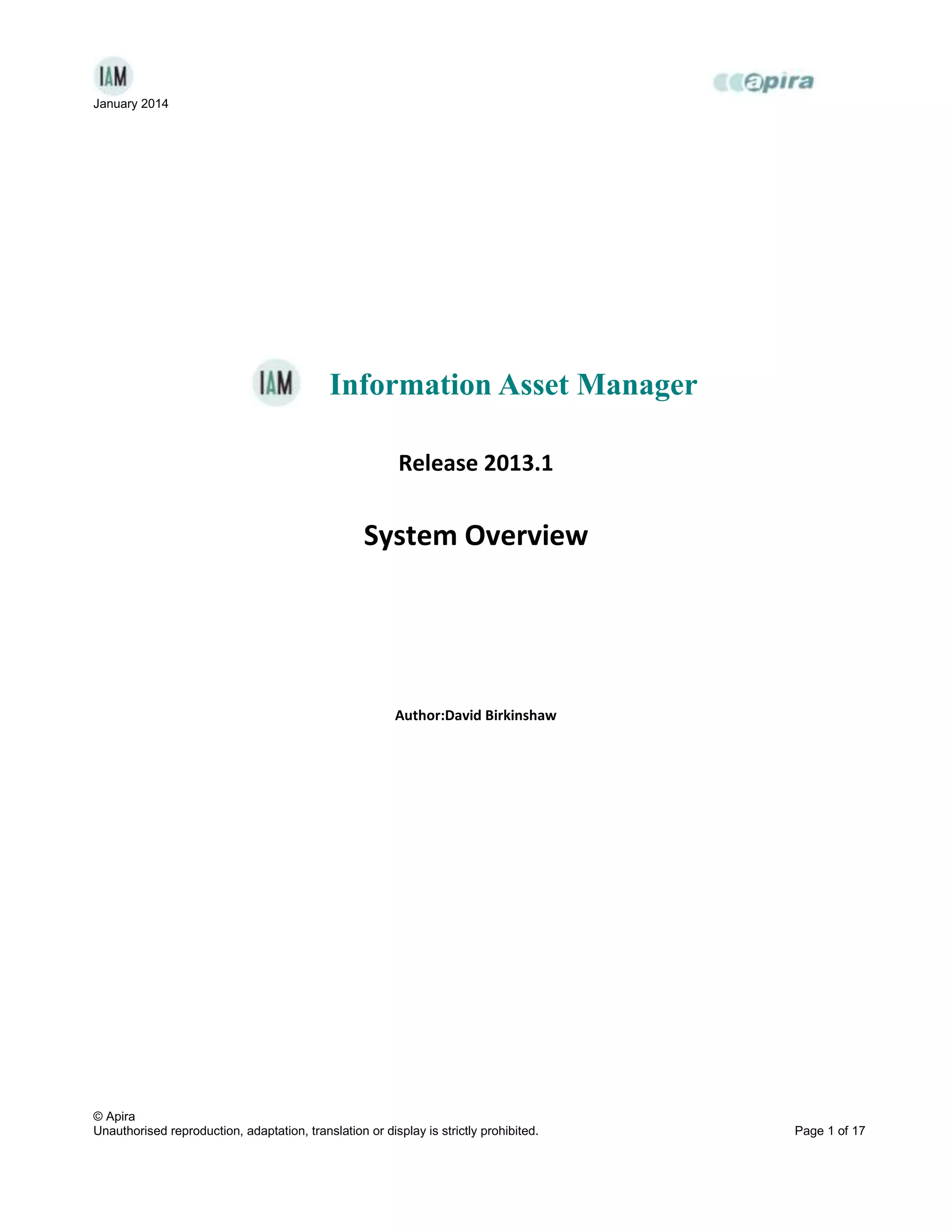 This document provides an overview of the Apira Information Asset Manager system. It describes the system's ability to record an organization's information assets and the flows of data between assets. This allows organizations to understand and manage the risks to their information. The document outlines how the system defines primary assets, supporting assets, and data flows. It also describes how the system sets up user profiles and responsibility roles to manage assets and flows. The system then calculates risk scores for both assets and flows to help organizations ensure their information is properly governed.
