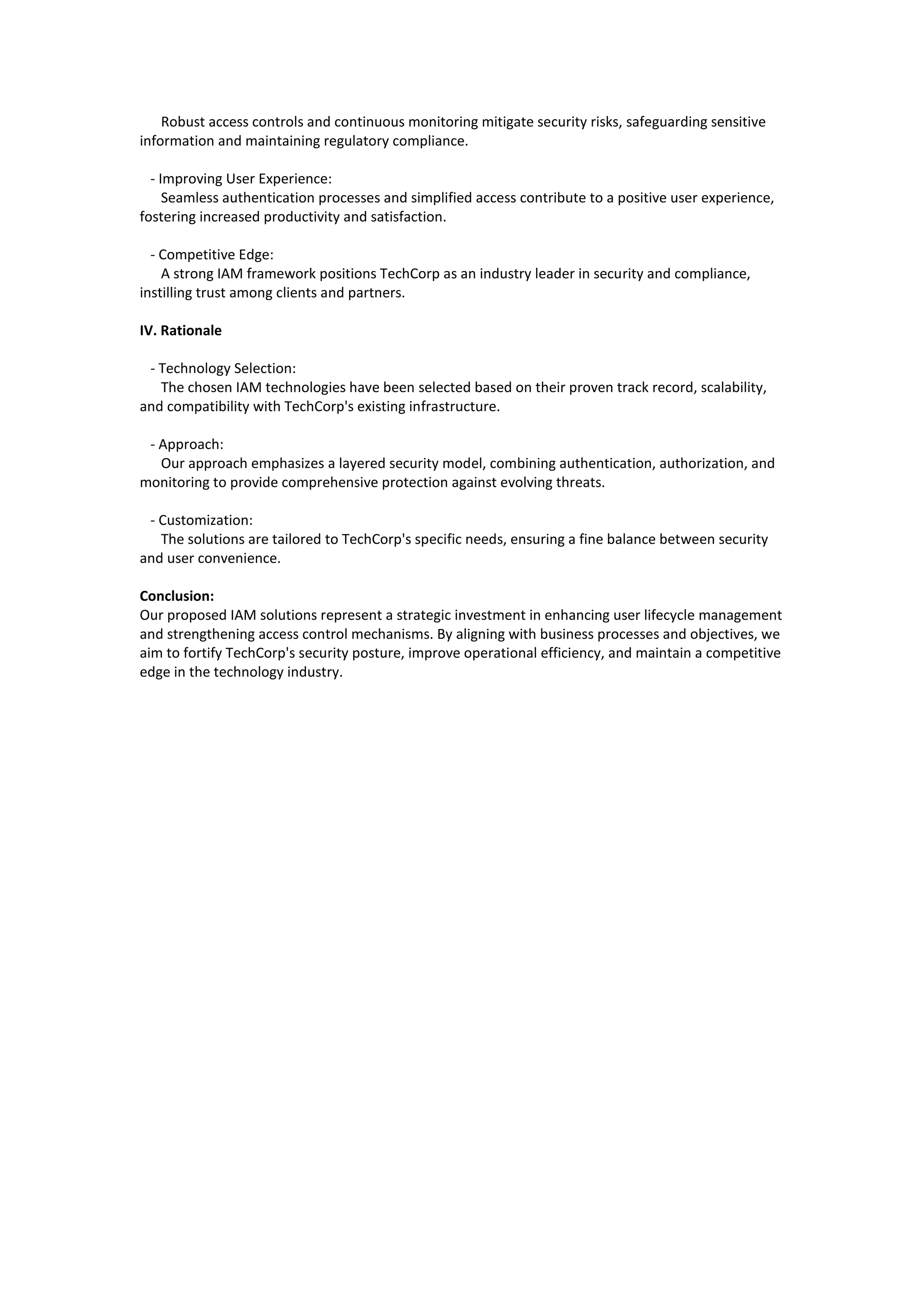 The document outlines IAM solutions focused on user lifecycle management and access control mechanisms for TechCorp, emphasizing security, efficiency, and user experience. Key features include automated processes, multi-factor authentication, and alignment with business objectives to mitigate risks and enhance operational efficiency. The proposed solutions aim to fortify security, improve user experience, and maintain a competitive edge in the technology industry.