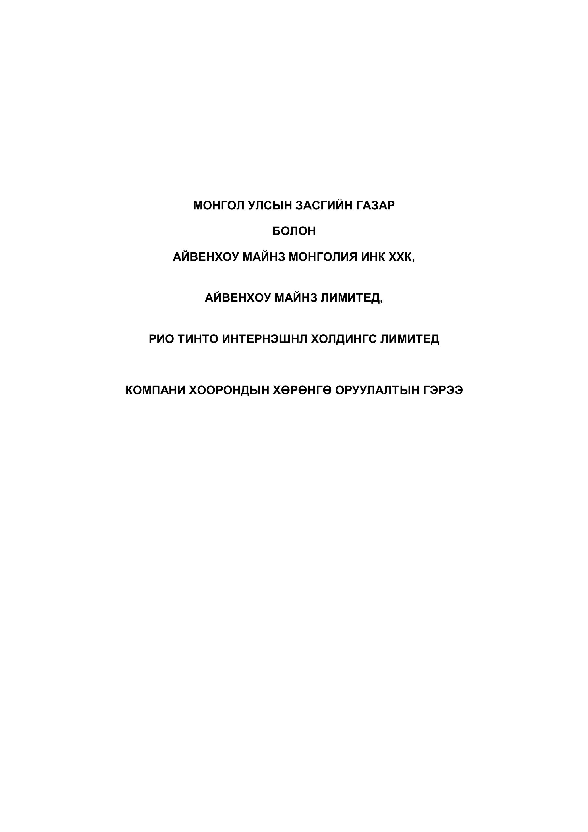 эсхүл бусад хэлэлцээр, баримт бичигт оролцогч аль нэг Талыг иш татвал энэ нь тухайн Талаас өвлөн авсан, эсхүл эрхийг шилжүүлэн авахаар зөвшөөрөгдсөн, эсхүл орлох эрхтэй Талд нэгэн адил хамаарна. III. тухайлбал, түүний дотор, жишээ нь, оруулан зэрэг хэллэгийн дараа орсон аливаа үгс нь бусад хамарч болох зүйлсийг хязгаарлахгүй. IV. Аль нэг тал нь энэхүү Гэрээ, эсхүл түүний аль нэг хэсгийг санал болгосон хэмээх цор ганц үндэслэлээр тухайн талын эсрэг энэхүү Гэрээний аль ч хэсгийг тайлбарлахгүй. Дээрхийг нотлон энэхүү Гэрээг 2009 оны 10 дугаар сарын 6-ны өдөр Улаанбаатар хотноо үйлдэв. Монгол Улсын Засгийн Газрыг төлөөлж Сангийн сайд: С. Баярцогт…………………………… Гарын үсэг Огноо: Эрдэс баялаг, эрчим хүчний сайд: Д. Зоригт…………………………… Гарын үсэг Огноо: Байгаль орчин, аялал жуулчлалын сайд: Л. Гансүх…………………………… Гарын үсэг Огноо: Айвенхоу Майнз Монголия Инк ХХК-ийг төлөөлж: Кийт Маршал……………………… Гарын үсэг Ерөнхий захирал Огноо: