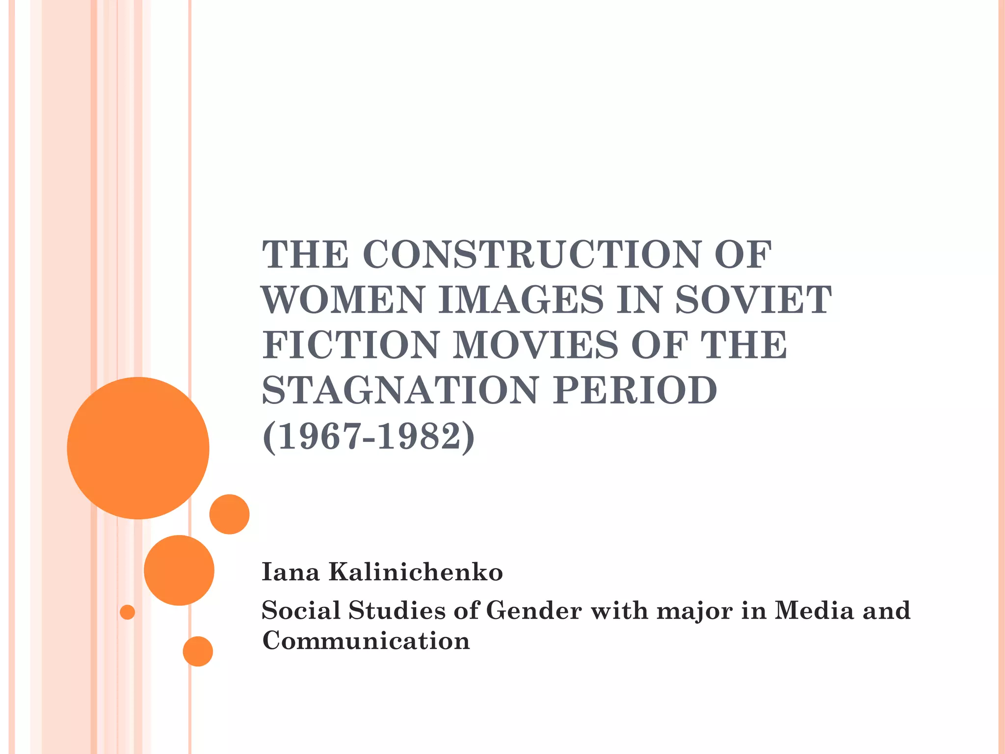 This document provides an overview of a research project analyzing the construction of women's images in Soviet fiction movies from 1967 to 1982. It examines how women are portrayed as workers, wives, and mothers through a discourse analysis of 5 popular movies from the period. Preliminary findings suggest the films replicated gender patterns from early Soviet cinema and displayed conflicts between women's work and family roles not publicly discussed until 1985. The research draws on literature about gender in Soviet and post-Soviet Russia to understand how the movies represented femininity and women's status through marriage.