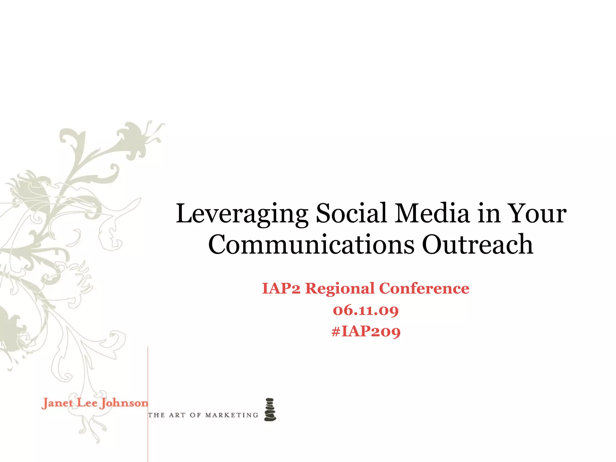 The document discusses the strategic use of social media for communication outreach, emphasizing its importance for building public engagement and trust. It highlights ethical considerations, the evolution of social media, and best practices for effective implementation, including the necessity of understanding organizational goals before engaging. A multi-phase approach to social media readiness is outlined, stressing ongoing evaluation and adaptation to improve organizational presence online.