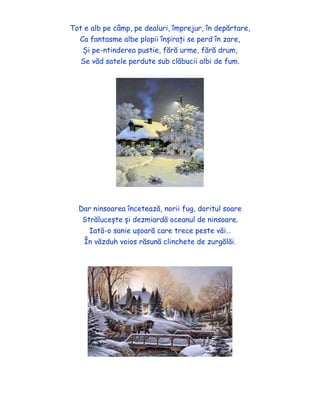 Poemul descrie o iarnă splendidă și misterioasă, cu zăpadă care acoperă țara și transformă peisajul într-un decor de vis. Fulgi de zăpadă plutesc în aer și țara se îmbracă într-o manta argintie, creeând o atmosferă de frumusețe și liniște. La final, soarele răsare, îndepărtând norii și aducând un sentiment de bucurie în mijlocul iernii.