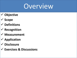 This document provides an overview of IAS 37 Provisions, Contingent Liabilities and Contingent Assets. It defines key terms including provisions, present obligations, past events, and probable outflows. It discusses the recognition and measurement of provisions, contingent liabilities, and contingent assets. Examples are provided for applying the standard to issues like warranties, legal claims, and restructuring plans. The document concludes with exercises assessing various scenarios in light of IAS 37 requirements.
