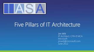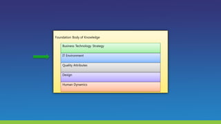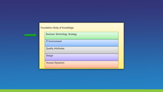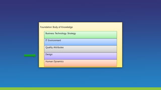 The document lists several distinguished fellows and their affiliations in enterprise architecture. It then discusses the development of the IT Architecture Body of Knowledge (ITABoK) which was informed by focus groups, a 7000 member survey, and asset creation. The document outlines the ITABoK framework which includes 5 pillars (human dynamics, design, quality attributes, IT environment, business technology strategy) and several specializations.