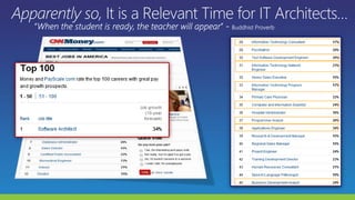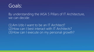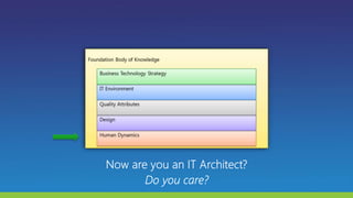 The document lists several distinguished fellows and their affiliations in enterprise architecture. It then discusses the development of the IT Architecture Body of Knowledge (ITABoK) which was informed by focus groups, a 7000 member survey, and asset creation. The document outlines the ITABoK framework which includes 5 pillars (human dynamics, design, quality attributes, IT environment, business technology strategy) and several specializations.