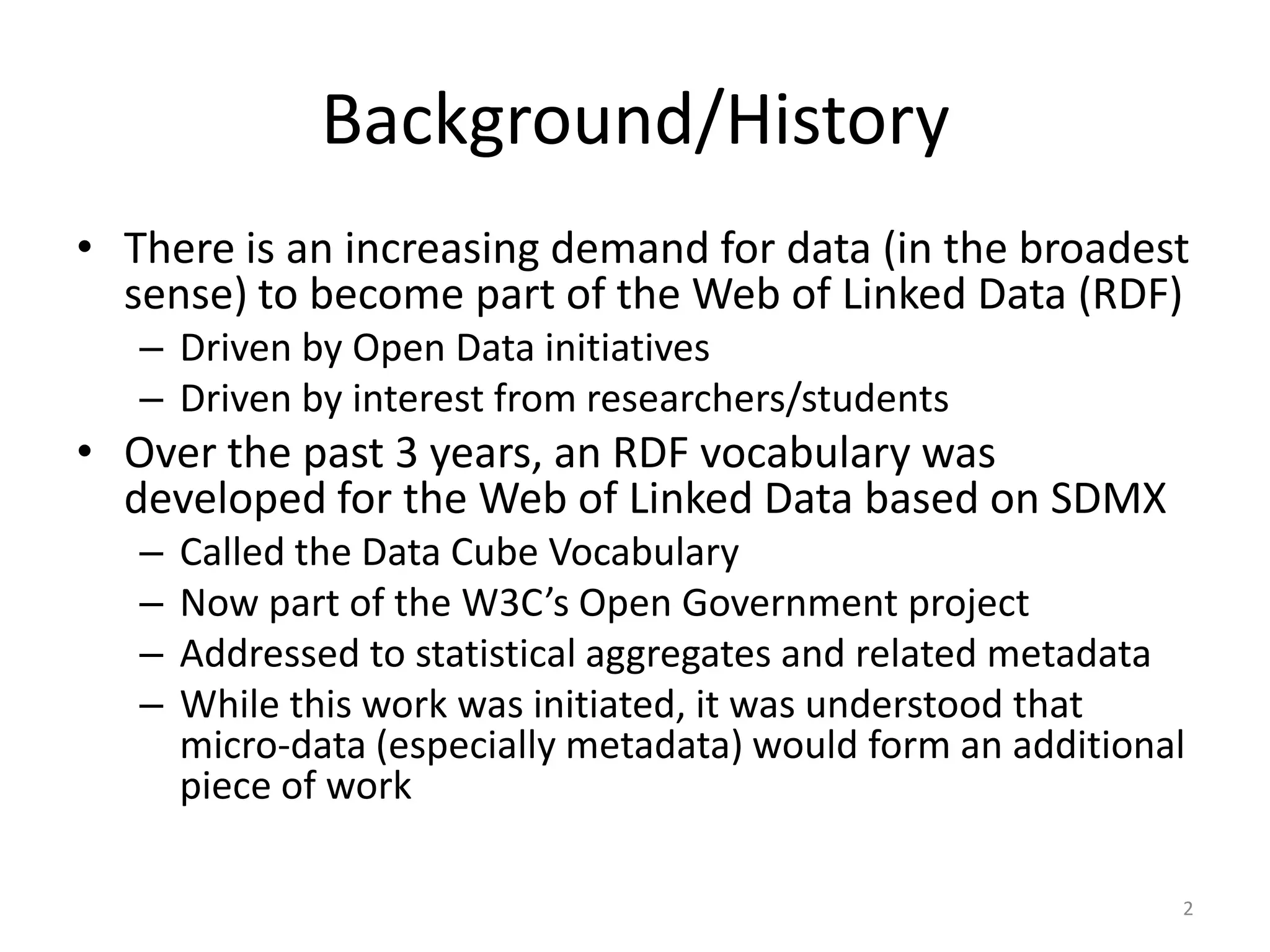 This document summarizes work being done to express the Data Documentation Initiative (DDI) metadata standard in Resource Description Framework (RDF) format to improve discovery and linking of microdata on the Web of Linked Data. It describes background on the DDI to RDF mapping effort, the goals of making microdata more accessible and interoperable online, and examples of how the RDF representation would support common discovery use cases. It also provides information on tools and next steps for the ongoing work, acknowledging contributions from participants in workshops where this effort was discussed.