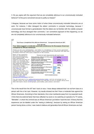 The document discusses unconsciously motivated behaviors and the results of an Implicit Association Test (IAT) on race. The author acknowledges having a moderate unconscious bias against African Americans, as shown by the IAT, despite believing they did not form biases based on race. They theorize that recently watching a TV show where the criminal was African American may have influenced the test results by unconsciously strengthening an association between African Americans and crime.