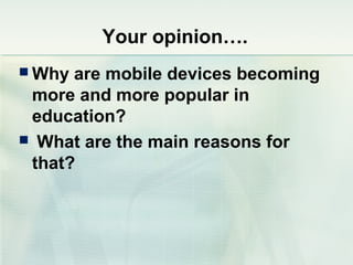 This document discusses challenges and perspectives in teaching "mobile natives" or students who have grown up with mobile devices in Russia. It notes that mobile devices have become widespread in Russia, with over 237 million mobile devices owned. It explores how mobile learning can provide just-in-time, collaborative learning and increase student motivation. Research with students found they are ready to use mobile devices for learning but teachers do not fully guide their use of educational apps. The challenges are developing teacher mobile literacy and strategies for integrating mobile devices into traditional classrooms.
