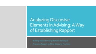 The document discusses analyzing rapport-building discourse functions in language advising sessions. It provides background on studies related to learner autonomy and language advising. The purpose is to examine how language advisors build rapport and identify strategies used. Research questions ask how rapport is built and what strategies are applied. The significance is that it provides information on language used to establish rapport.