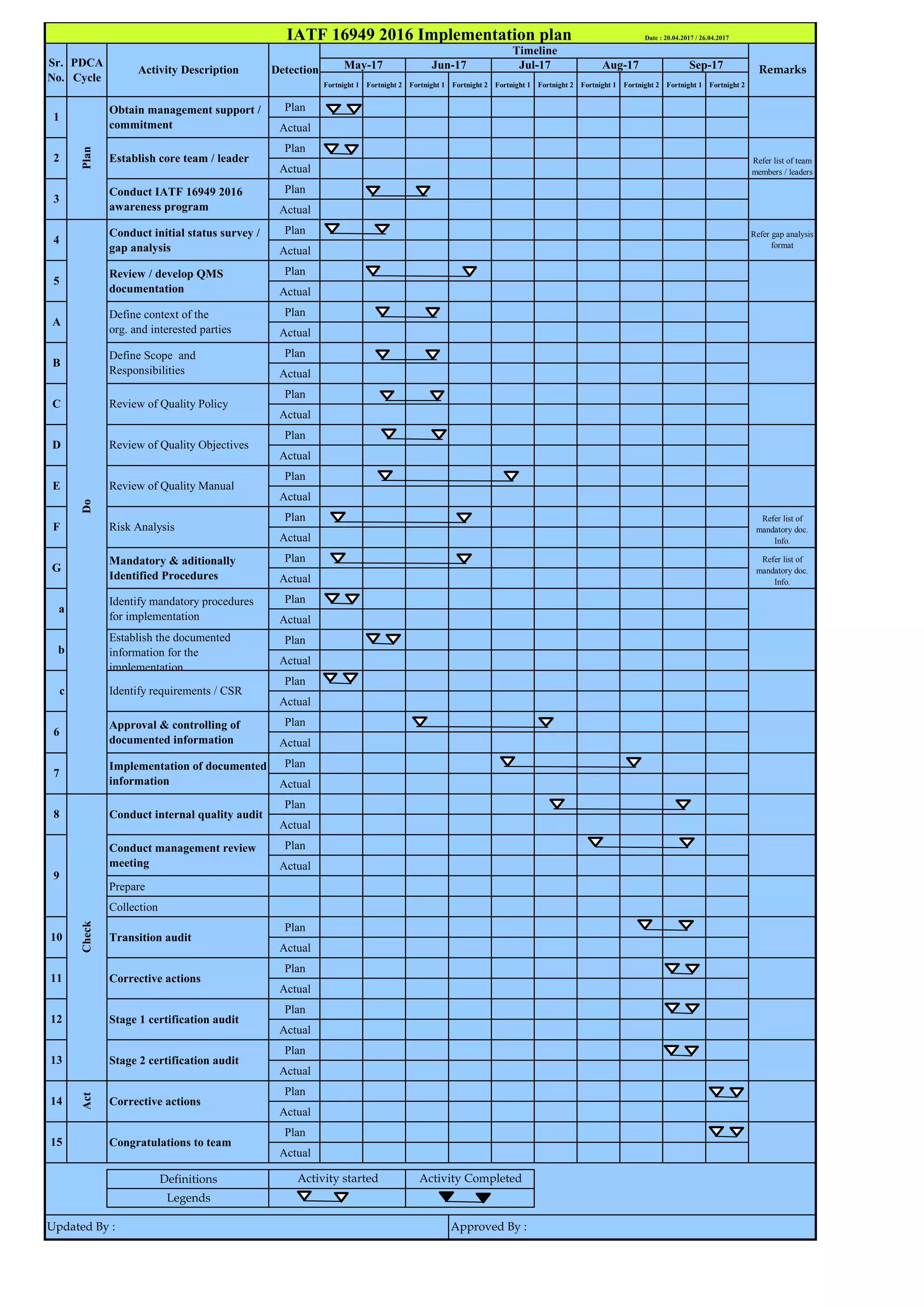 The document contains an implementation plan for IATF 16949:2016 certification over four quarters from May 2017 to April 2018. It includes planning activities such as obtaining management support, establishing an implementation team, defining the organization's context and scope, reviewing quality policies and procedures, and identifying mandatory documentation requirements. Implementation activities involve developing and approving the required documentation, providing awareness training, conducting internal audits and management reviews, and completing stage one and two certification audits to achieve certification.