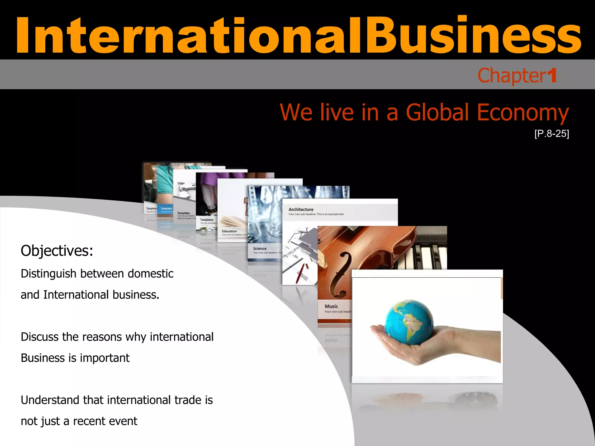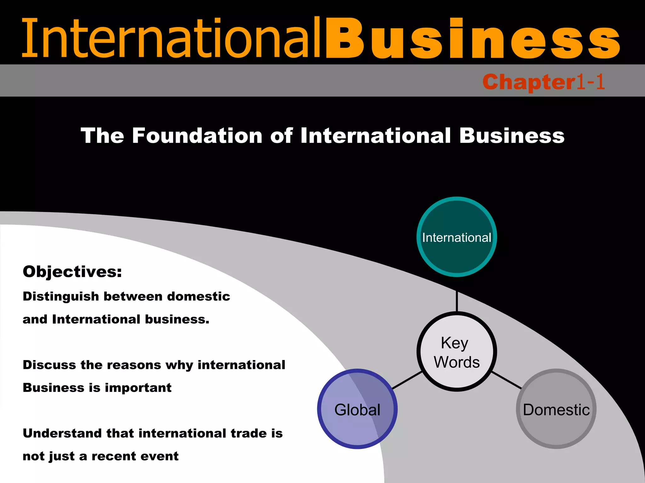 This document discusses the foundations of international business. It distinguishes between domestic and international business and explains why international business is important. It notes that international trade has a long history and is not a recent phenomenon. Key topics covered include the components of the international business environment, basic international business activities like imports and exports, and trade barriers between countries.
