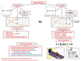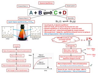 The document discusses dynamic equilibrium in chemical reactions. It explains that in a closed system, reversible reactions proceed in both the forward and reverse directions at the same rate, such that the concentrations of reactants and products remain constant over time. It provides examples of chemical equilibria and how equilibrium is achieved as the reaction progresses through opposing changes in reaction rates and concentrations. Equilibrium constants are also introduced which relate the concentrations of products and reactants at equilibrium.