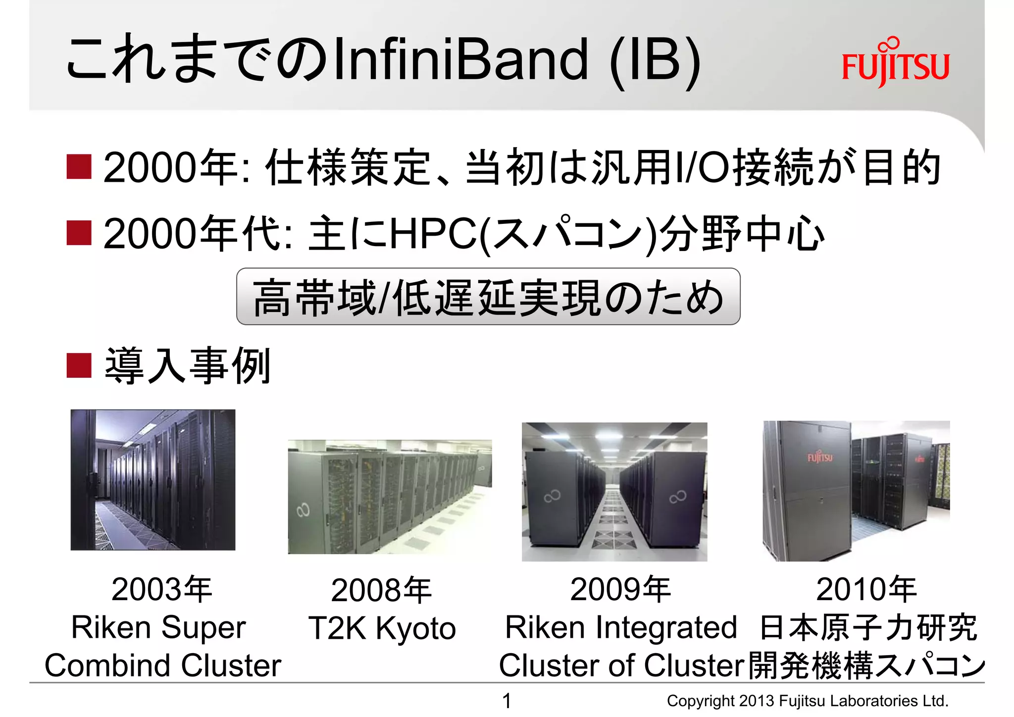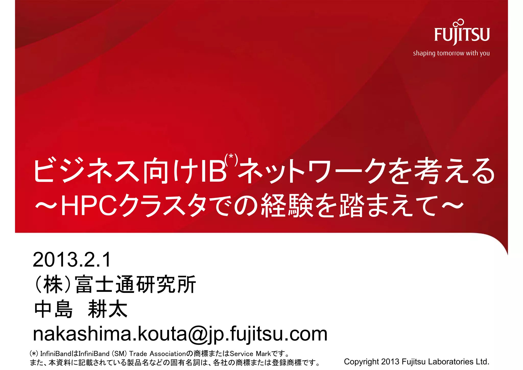 ビジネス向けIBネットワークを考える ~HPCクラスタでの経験を踏まえて~ 2013.2.1 株式会社富士通研究所 中島耕太 Infiniband DAY [06] Business Conference for Enterprise/Web Service.