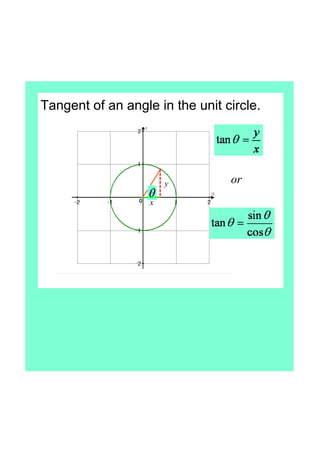 This document defines tangent as the ratio of the opposite to adjacent sides in a right triangle defined by an angle in a unit circle. It finds the exact values of sine, cosine, and tangent for common angles like 45°, 60°, and 30°. The document concludes that tangent is undefined for 90° and 270° and is positive in quadrants I and III and negative in quadrants II and IV.