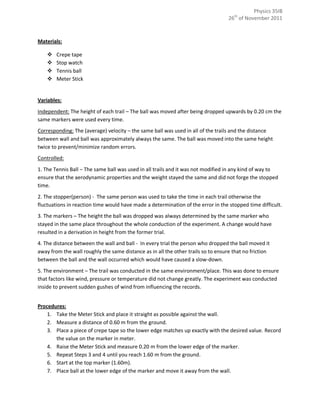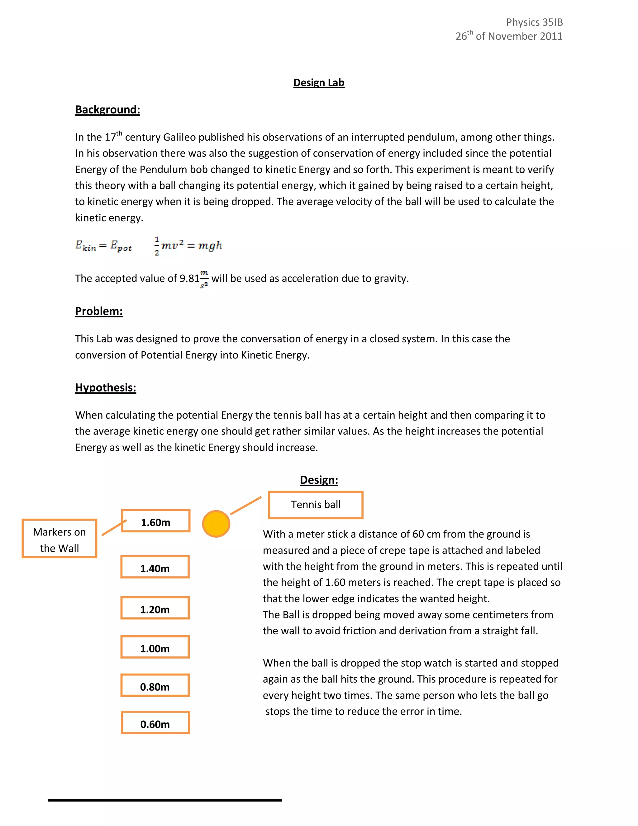 This physics lab experiment was designed to verify Galileo's theory of conservation of energy by measuring the potential and kinetic energy of a falling tennis ball. The ball was dropped from various heights and its time of fall was recorded. Calculations showed the potential energy was about 3 times greater than the kinetic energy, failing to prove conservation of energy. Sources of error included air resistance, imprecise timing of when the ball hit the ground, and too few trials. Improving the experiment could help address these issues and better test the hypothesis.
