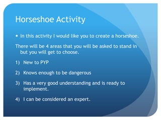 The document outlines the stages of planning a PYP unit using the "Bubble Planner". It includes 9 stages: 1) identifying the central idea and transdisciplinary theme; 2) key concepts, lines of inquiry, and driving questions; 3) assessing prior knowledge and student learning; 4) learning activities; 5) resources; 6) evaluating student understanding; 7) inclusion of PYP elements; 8) improvements; and 9) successful experiences. The planner is used to ensure PYP units incorporate essential elements like conceptual understanding, skills development, and learner profile attributes.