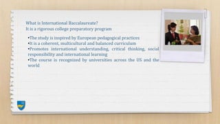 The International Baccalaureate (IB) is a rigorous, globally recognized college preparatory program with a multicultural curriculum aimed at promoting critical thinking and social responsibility. Established in 1978, it now includes over 2000 schools worldwide, including CPS Global School in San Francisco, which offers a variety of subjects and comprehensive learning experiences beyond academics. The program helps students develop skills and interests aligned with their career goals, providing a competitive edge in higher education.