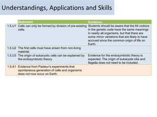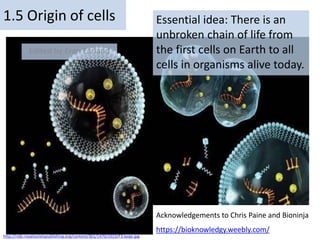 The document discusses the origin of the first cells on Earth. It states that cells can only be formed through the division of pre-existing cells, so the first cells must have arisen from non-living material through a process known as abiogenesis. Abiogenesis likely occurred in four stages: 1) the non-living synthesis of simple organic molecules, 2) the assembly of these molecules into complex polymers, 3) the development of polymers that could self-replicate, and 4) the encapsulation of these molecules within membranes. Early Earth had a reducing atmosphere containing gases like hydrogen, nitrogen, and methane that could have contributed to the non-living synthesis of organic compounds from which the first cells developed.